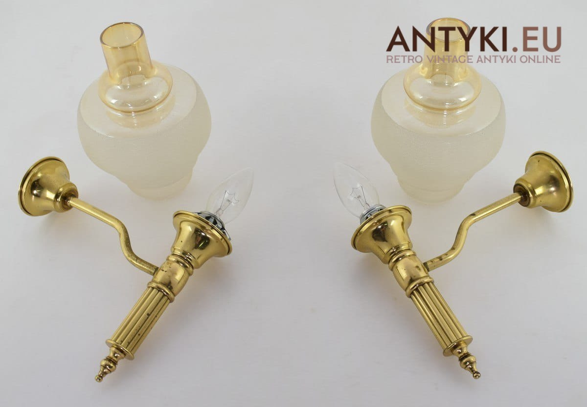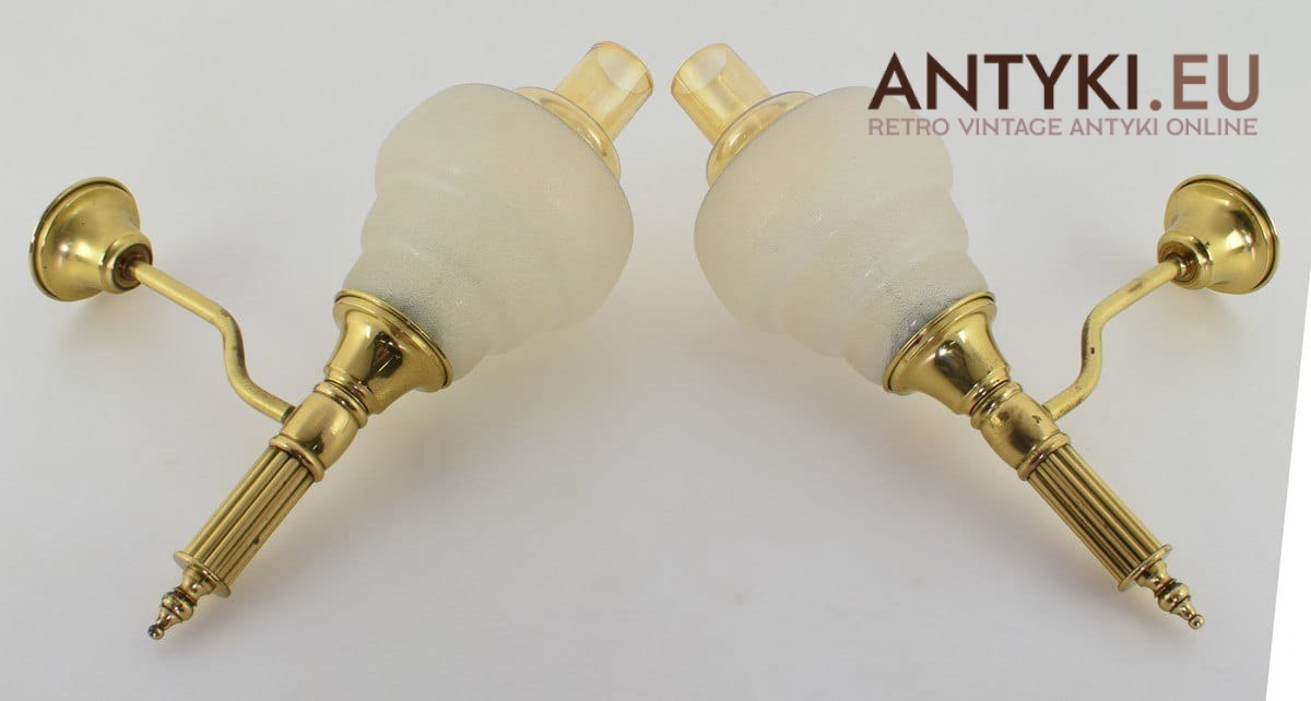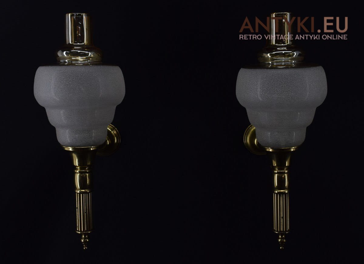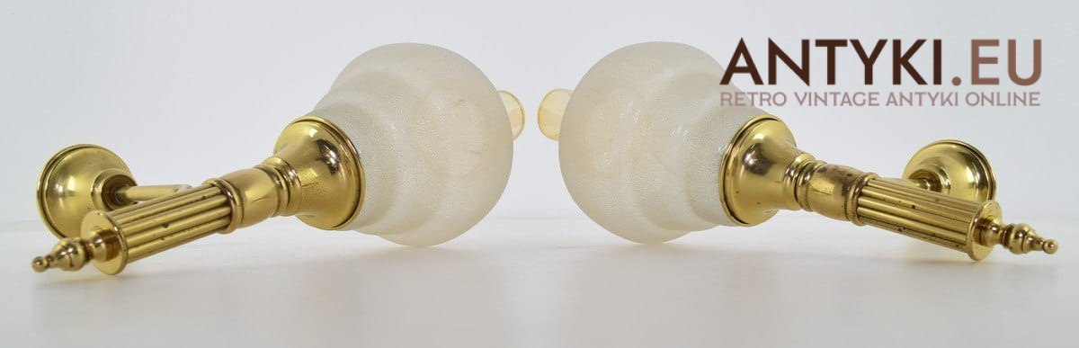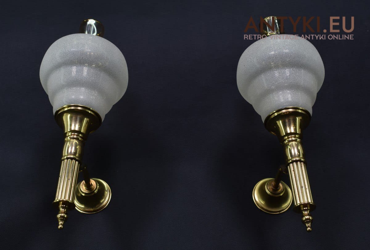 Bardzo ładna para kinkietów wykonanych z mosiądzu + szklane klosze o specjalnej strukturze. Stare kinkiety sprowadzone z Francji, pochodzą z lat 1950-60. Stan bardzo dobry. Klosze i kinkiety bez uszkodzeń. Z tyłu jest specjalne miejsce na montaż ścienny. Elektryka sprawna. Standardowe żarówki E14 o maksymalnej mocy 60 watt każda. Wysyłka bez żarówek.