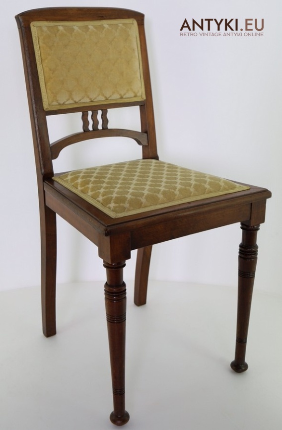 Antyczne krzesło z pierwszej połowy XX wieku, wykonane w stylu klasyczno–eklektycznym. Solidna konstrukcja z drewna (prawdopodobnie buk lub dąb), które zachowało swój szlachetny kolor i naturalny połysk. Przednie nogi są pięknie toczone i zdobione pierścieniami, co dodaje lekkości i elegancji, natomiast tylne wygięte dla stabilności.