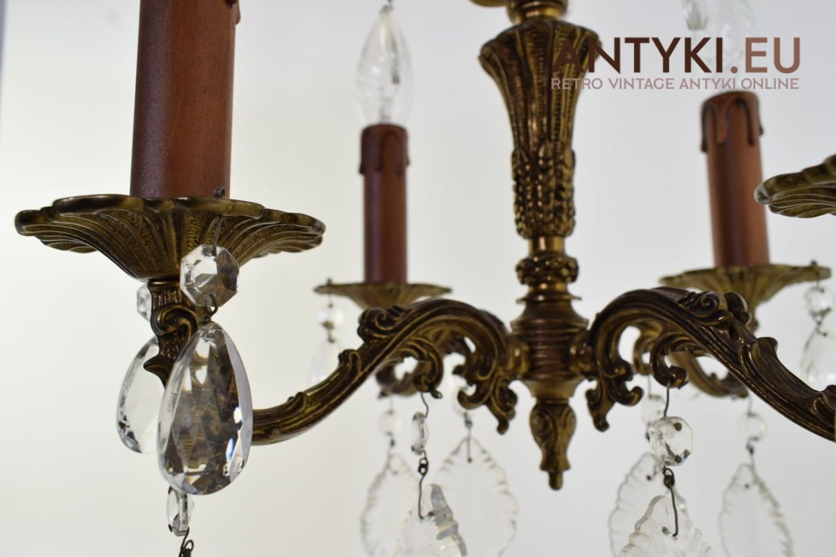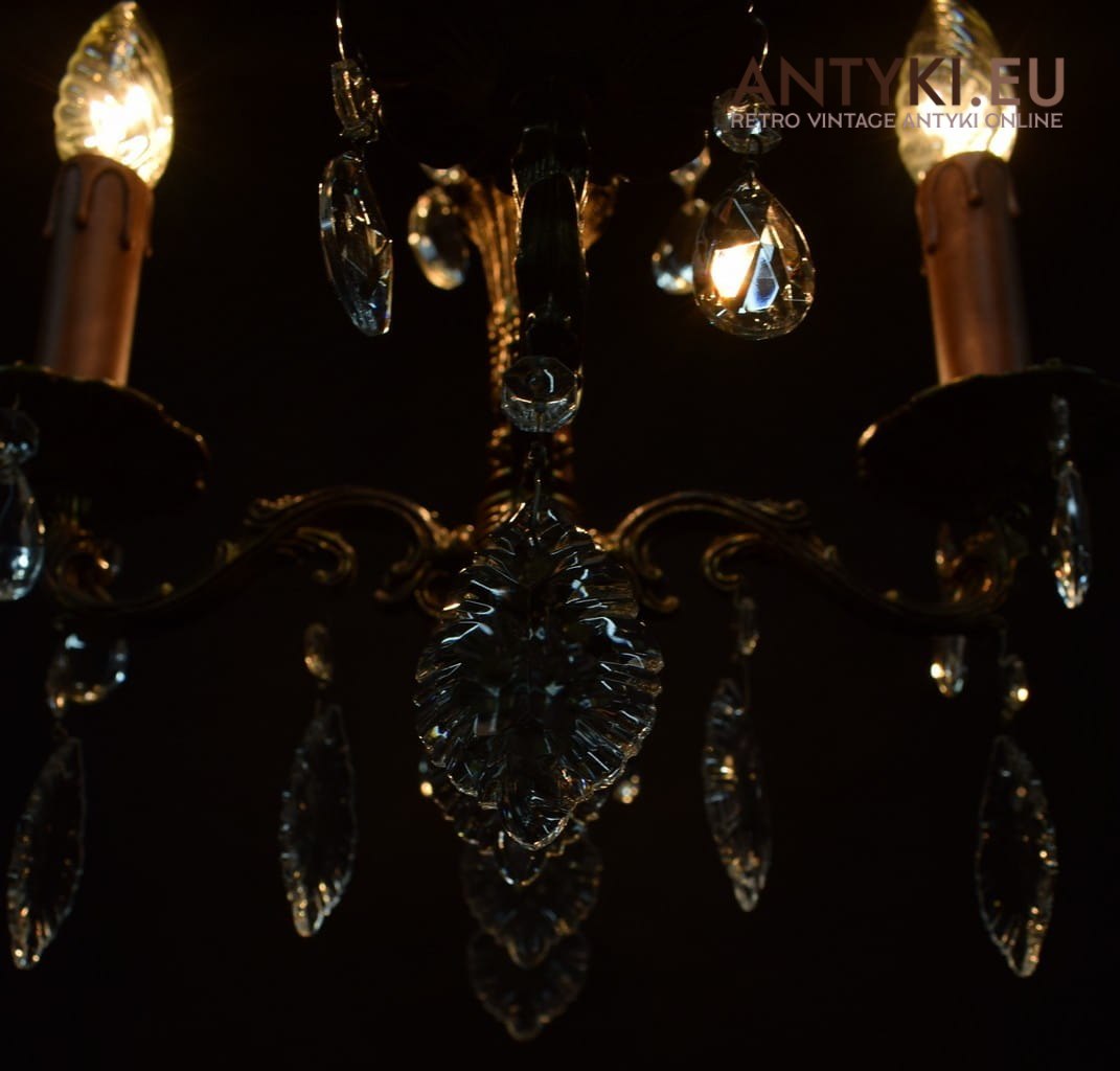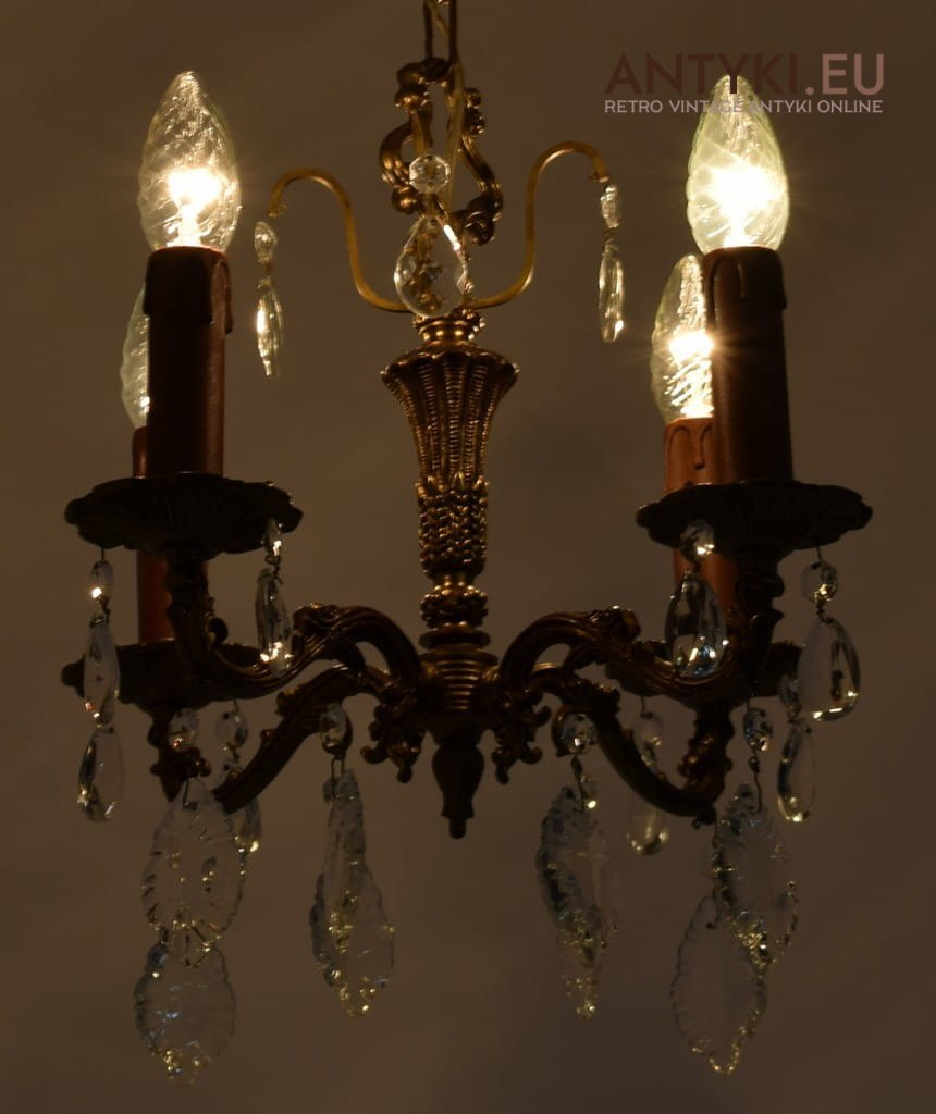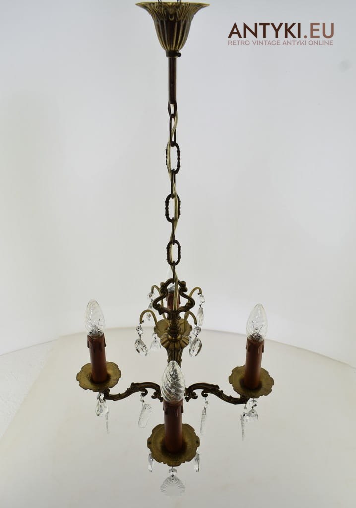 Antyczny mini żyrandol mosiężny z kryształami. Unikatowe lampy zabytkowe.