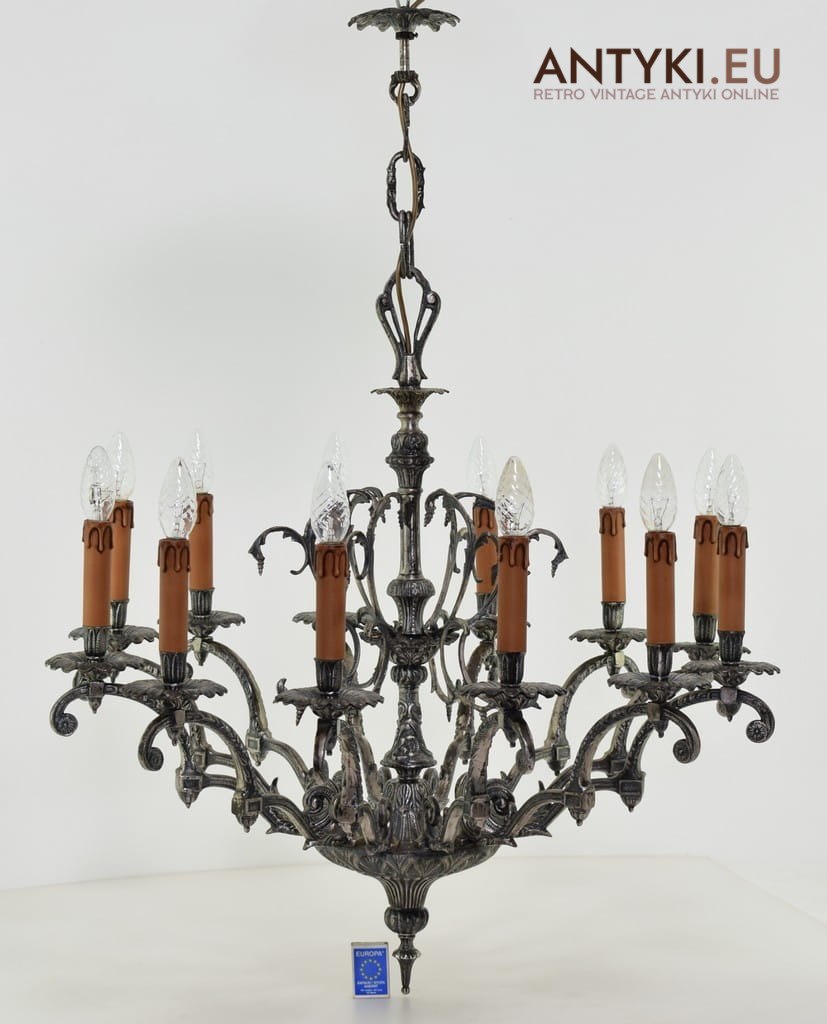 Żyrandol wykonano z ciężkich odlewów brązu lub mosiądzu, co gwarantuje jego trwałość i solidność – dziś rzadko spotykaną z uwagi na wysokie koszty tych materiałów. Całość pokryta jest specjalną powłoką galwaniczną w kolorze starego srebra, co podkreśla jego unikatowy wygląd i zabytkowy urok. To bardzo istotna cecha, która czyni ten egzemplarz wyjątkowym i odróżnia go od zwykłych modeli.
