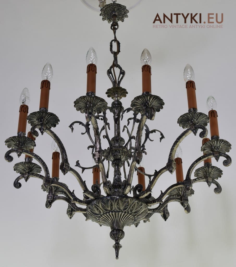 Przedstawiamy wyjątkowy żyrandol pałacowy vintage, wykonany z masywnych odlewów brązu lub mosiądzu, sprowadzony z Francji. Ten imponujący model to doskonały przykład stylu barokowego, datowany na lata 1940/50. Wyjątkową cechą tej lampy jest szlachetne wykończenie w kolorze starego srebra, uzyskane dzięki procesowi galwanizacji, co nadaje jej niezwykły, historyczny charakter i elegancję.