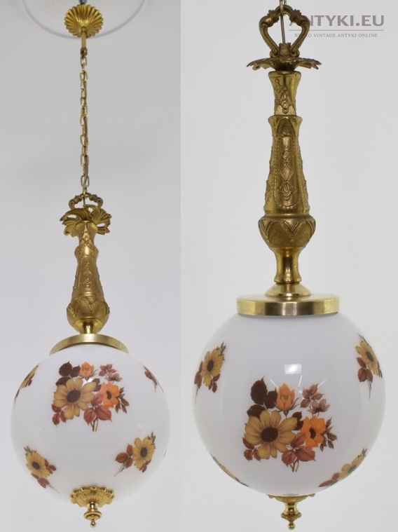 Wykonany z masywnego mosiądzu + gruby mleczny klosz szklany z dekoracją kwiatową oraz mosiężną ozdobą.