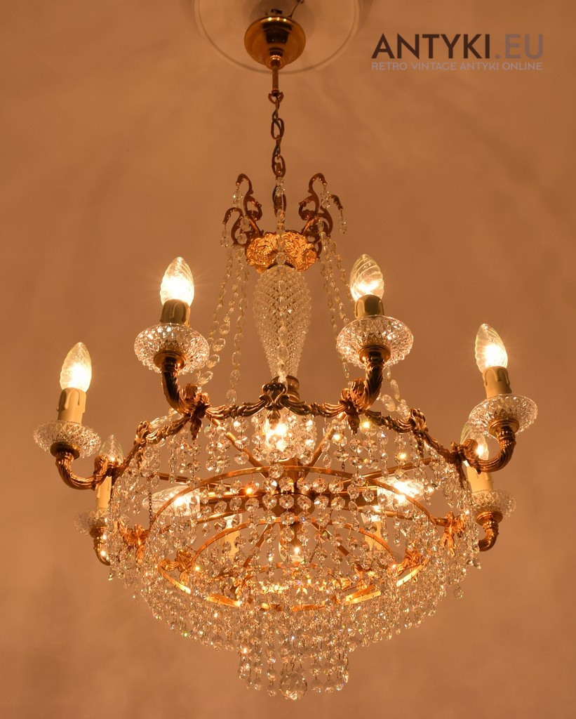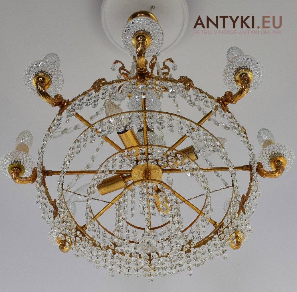 Sprowadzony z Austrii. Pochodzi z połowy ubiegłego wieku. Wykonany z masywnego mosiądzu o kolorze ZŁOTA + prawdziwe kryształowe zawieszki w stylu Swarovski. Oryginalne kryształy rozczepiają światło i dają piękne mieniące się tęczowe kolory. Niestety ciężko to uwiecznić na zdjęciach, ale na żywo wygląda to obłędnie! 100% kompletne, w bardzo dobrym stanie. Kryształowe talerzyki pod gilzami. Zero plastiku!
