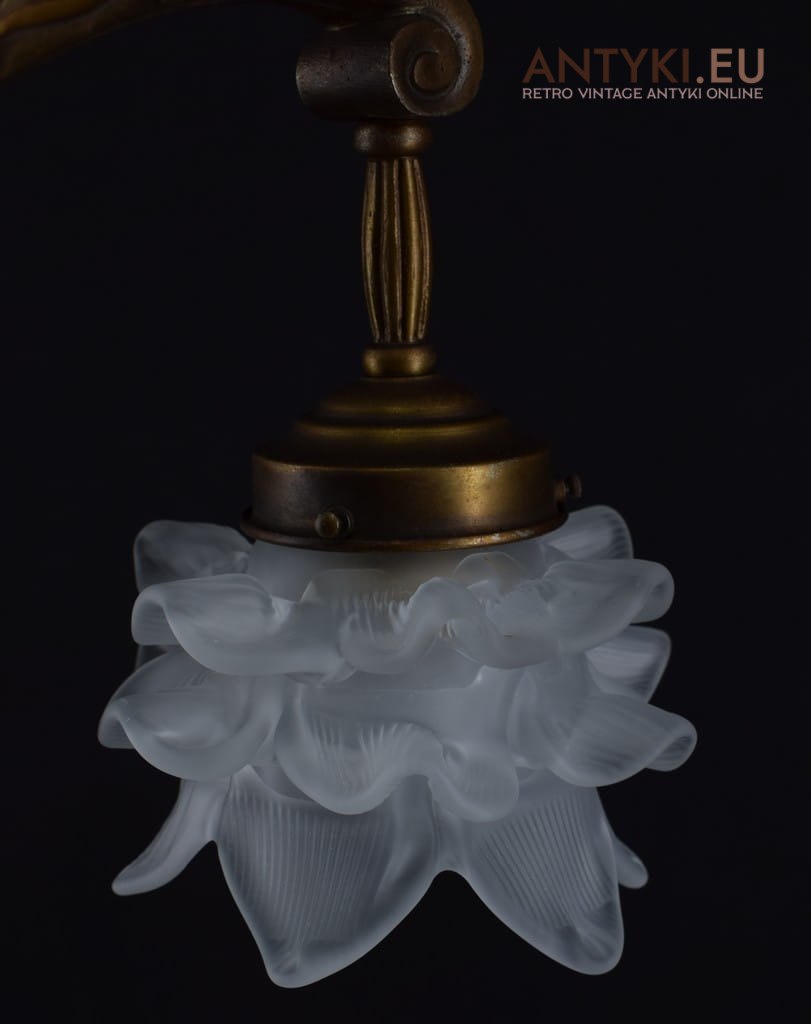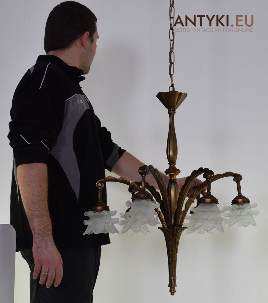 Antyczny żyrandol salonowy z kloszami. Lampy zabytkowe unikatowe.