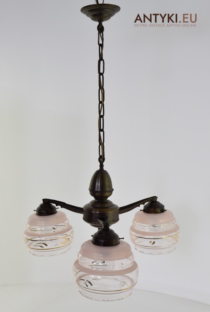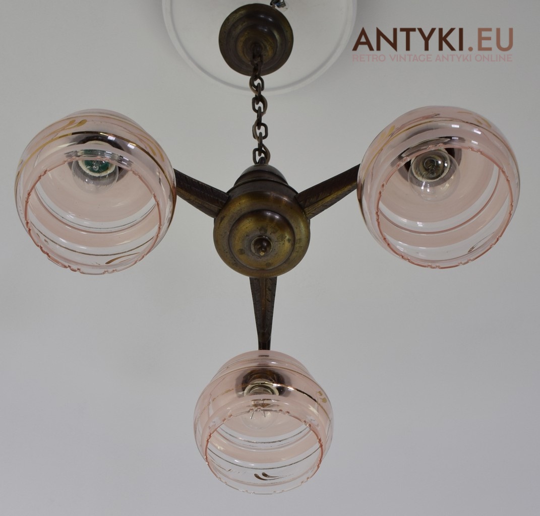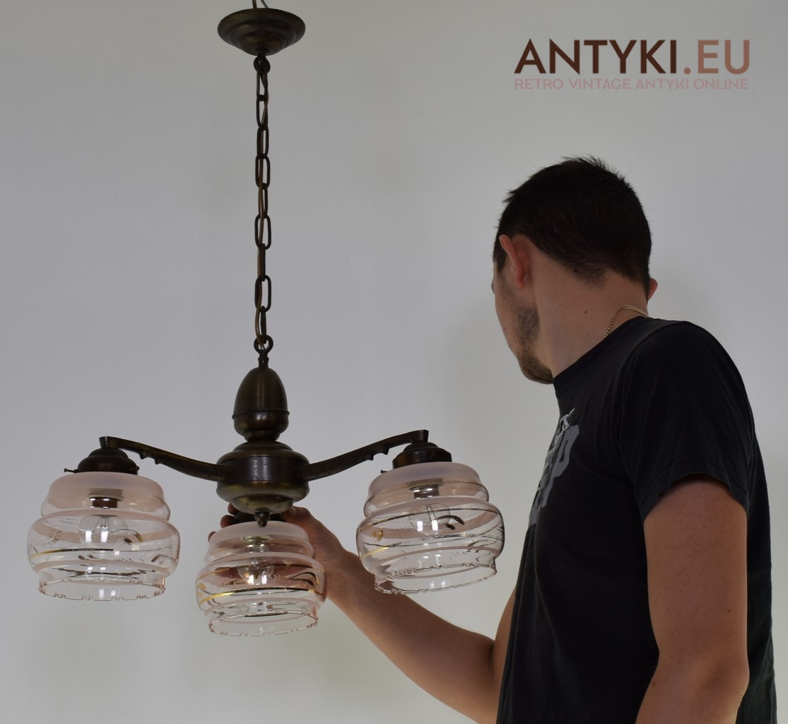 Art Deco muzealny żyrandol 3 ramienny z kloszami. Lampy retro.