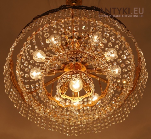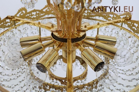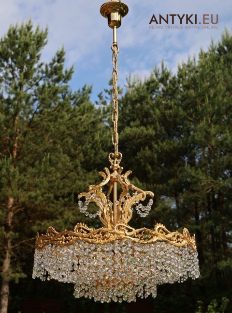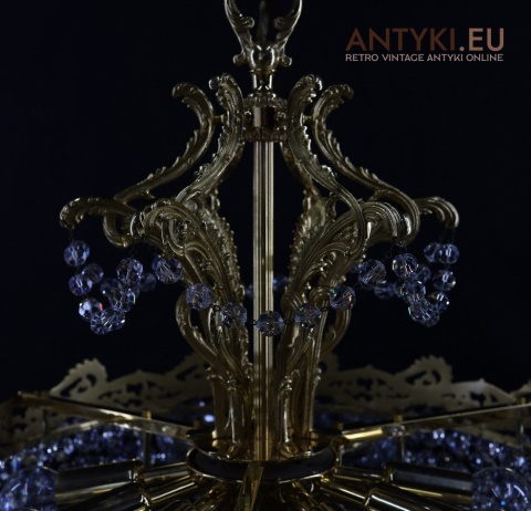 Przedstawiamy antyczny, pałacowy żyrandol z lat 1960–1970, sprowadzony z Francji – oryginalny egzemplarz wykonany z litego mosiądzu (nie mosiądzowany, lecz pełne odlewy!) oraz bogato zdobiony kryształami, które pięknie załamują światło w kolorach tęczy 🌈. Kryształy rozszczepiają światło tworząc niezapomniane efekty świetlne, co jest bardzo trudne do złapania i pokazania na fotografii, ale w realu to niezwykły i piękny pokaz iluminacji świetlnej. To vintage oświetlenie to kwintesencja stylu pałacowego/barokowego, łączącego przepych, symetrię i wyrafinowane detale.