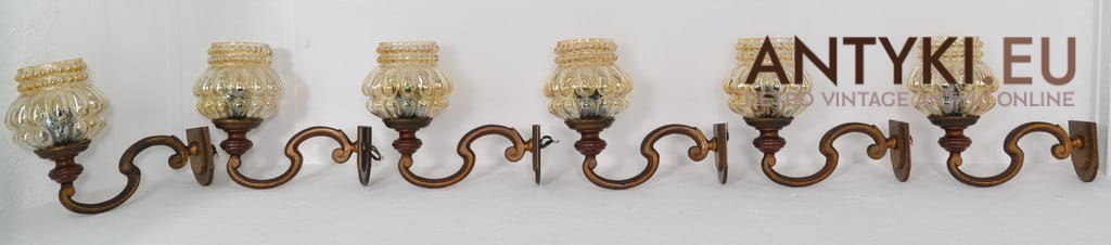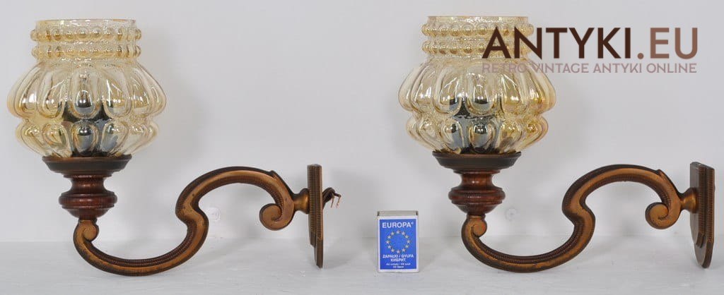 Konkretne kinkiety sprowadzone z Austrii. Pochodzą z połowy ubiegłego wieku. Wykonane z mosiądzu, litego drewna + grube szklane klosze w super stanie.
