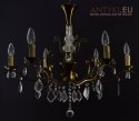 Stary żyrandol jest wykonany z mosiądzu i prawdziwych kryształowych zawieszek. Spód żyrandola jest zwieńczony szlifowaną kryształową kulą. Szklany ozdobny element w górnej części korpusu lampy dodaje szyku i uroku tej muzealnej lampie.
