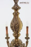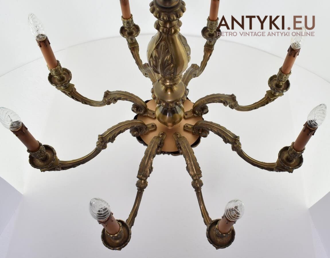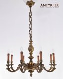 Zabytkowy żyrandol w stylu eklektycznym wykonany z bardzo dobrej jakości odlewów. Eklektyzm w sztuce to twórczość łącząca treści z różnych stylów i różne elementy. Waga tego zabytkowego żyrandola jest imponująca bo jest około 20kg!!! brązu. Stare oświetlenie tego typu, nadaje się do różnych aranżacji wnętrz, zaczynając od stylu klasycznego a kończąc na ekskluzywnych pomieszczeniach. Jedno jest pewne, ten antyczny żyrandol będzie perełka w każdym pomieszczeniu i spełni oczekiwania nawet najbardziej wymagających koneserów sztuki.