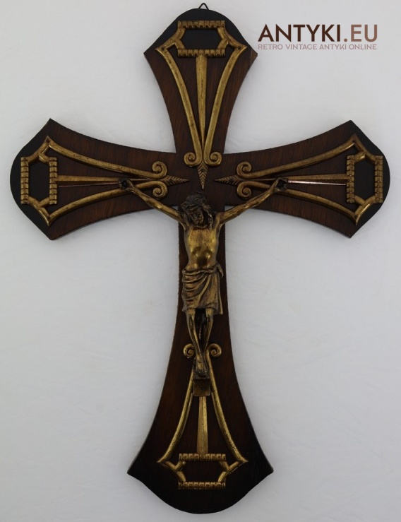 Zabytkowy krzyż ścienny z pierwszej połowy XX wieku, wykonany z litego drewna i zdobiony pięknymi mosiężnymi aplikacjami oraz figurą Chrystusa. Zero plastiku! Całość utrzymana w duchu klasycznych dewocjonaliów vintage, charakterystycznych dla ówczesnych warsztatów rzemieślniczych.