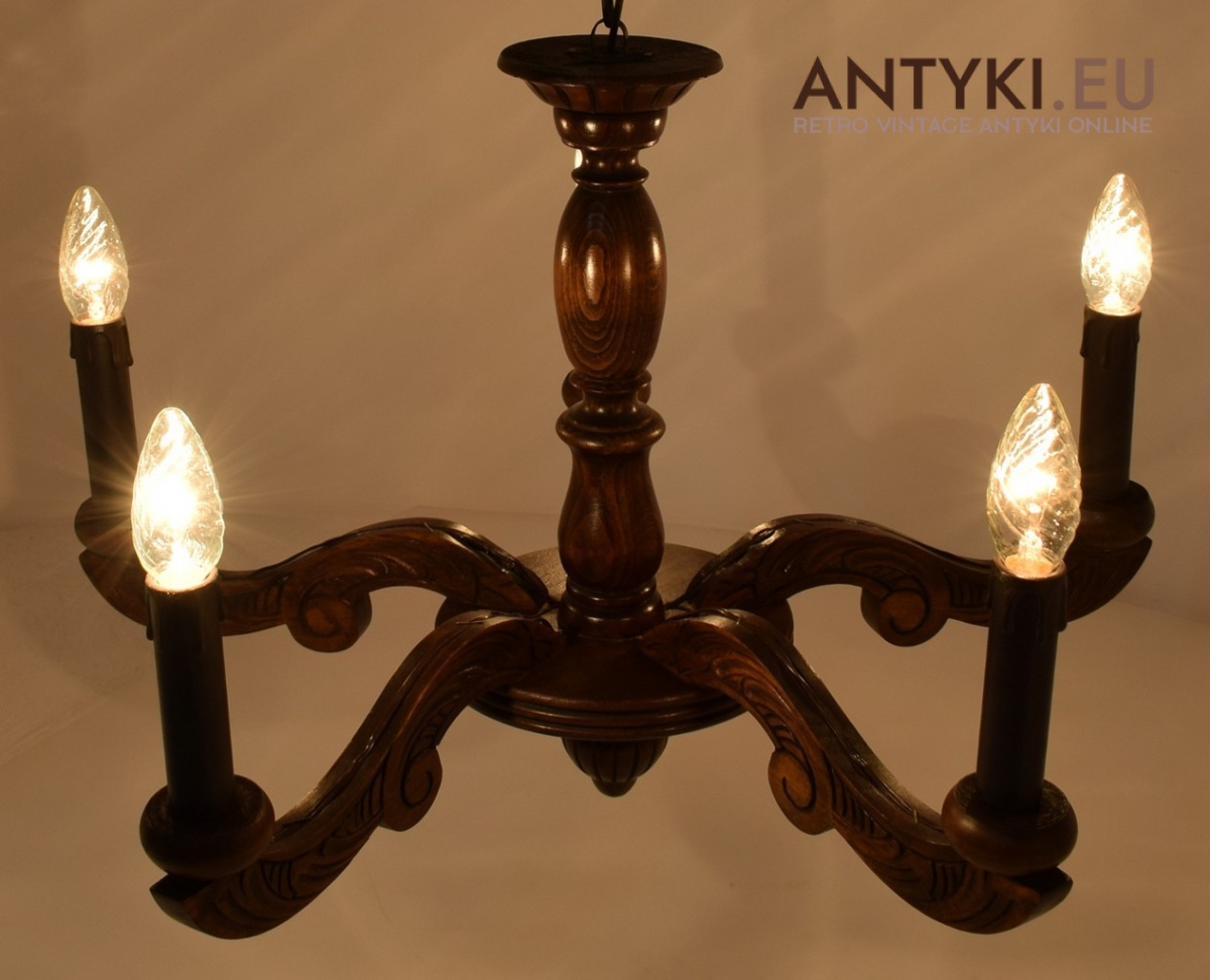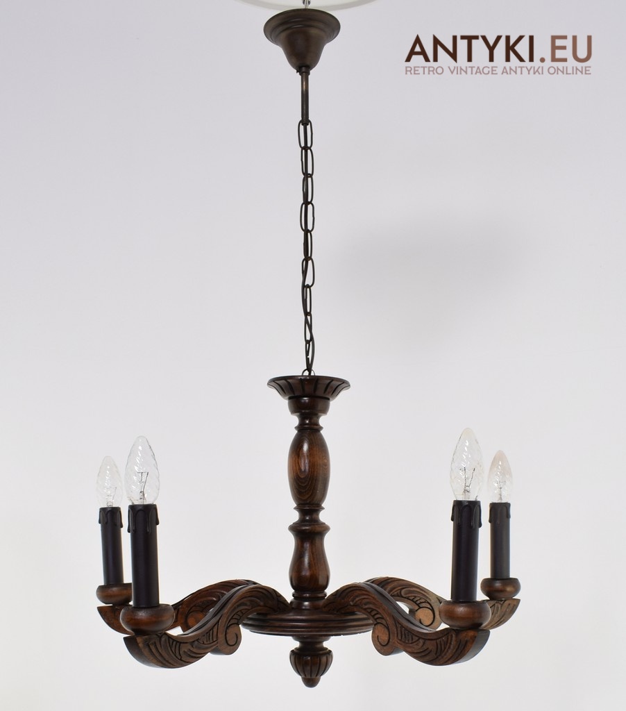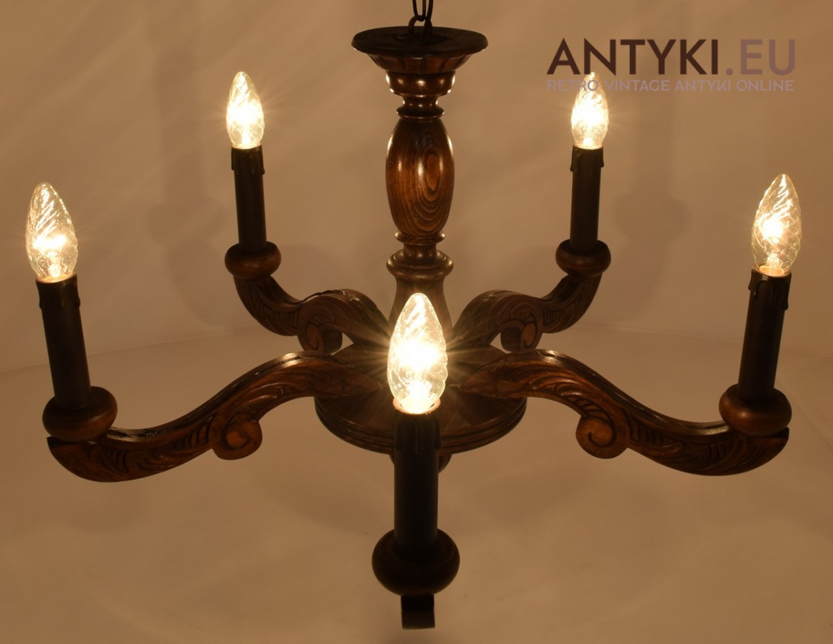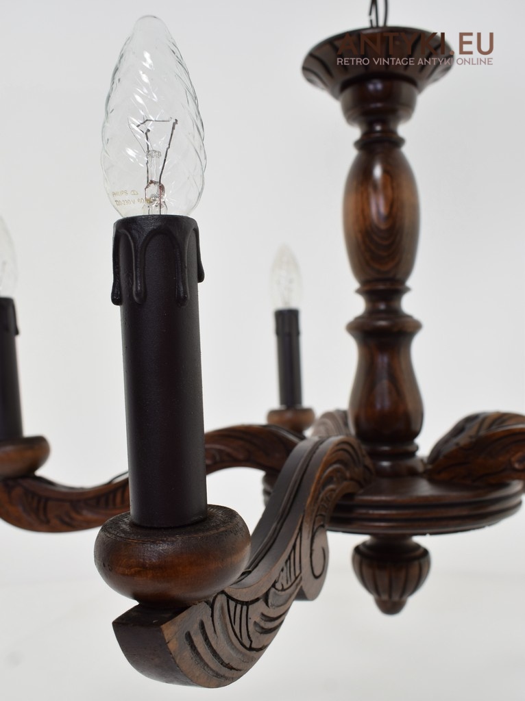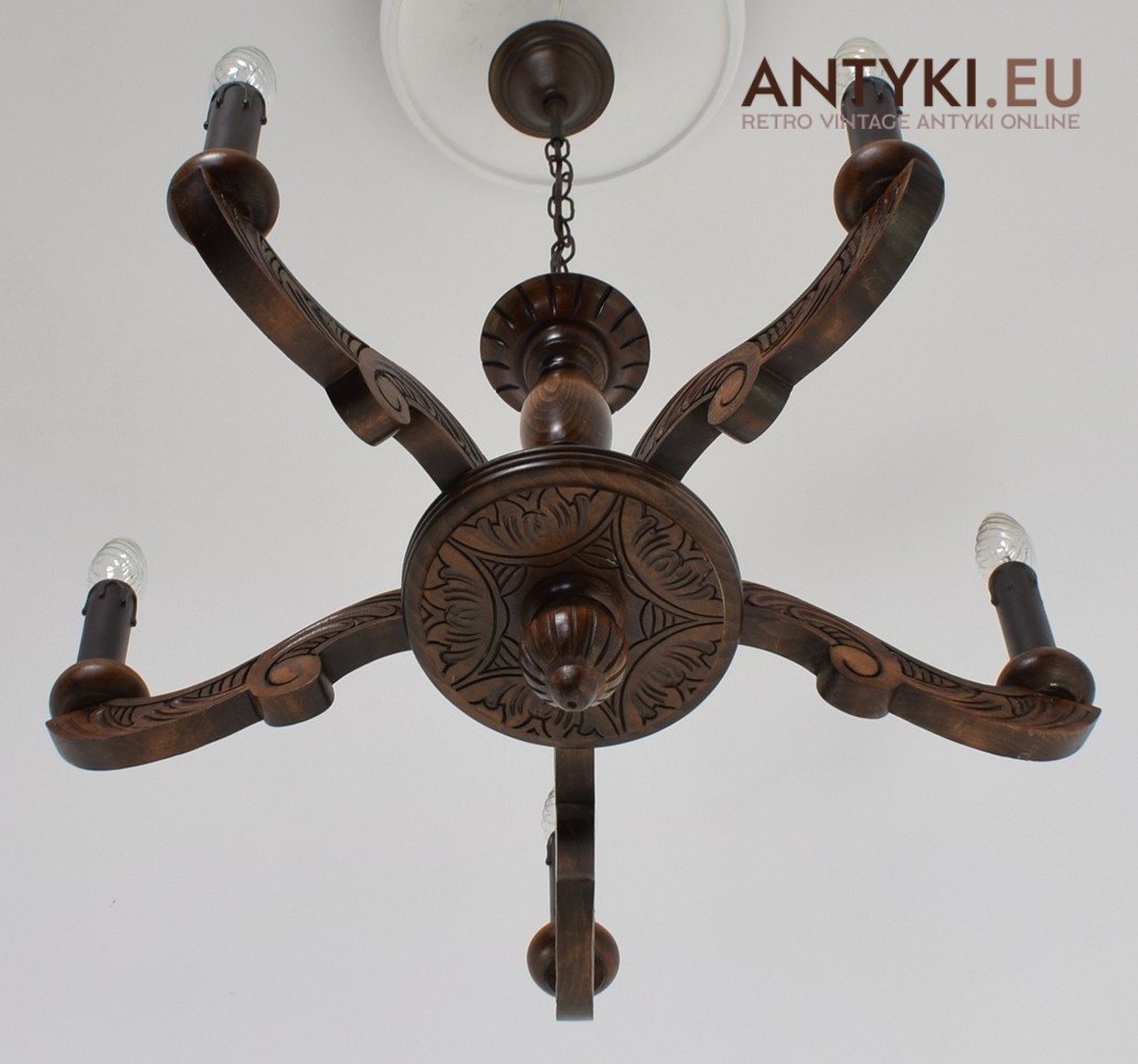 Mały zabytkowy żyrandol drewniany w eklektycznym stylu.