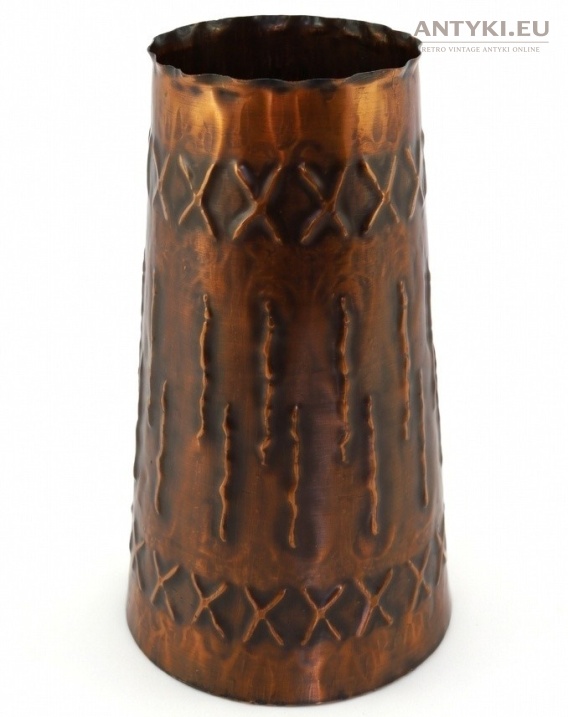 Przedmiot zachował bardzo dobry stan, z naturalnym kolorem starej miedzi i bez uszkodzeń, które psułyby jego wygląd lub funkcję. Taki pojemnik retro świetnie odnajdzie się jako parasolnik, wazon na suszone kwiaty, dekoracyjny pojemnik do gabinetu albo stylowa śmietniczka vintage. Rozszerzana ku dołowi forma sprawia, że prezentuje się stabilnie i bardzo efektownie. To praktyczny, a jednocześnie dekoracyjny przedmiot z epoki, który wnosi do wnętrza ciepły, historyczny klimat.