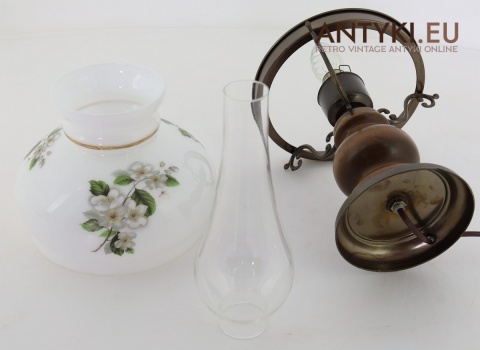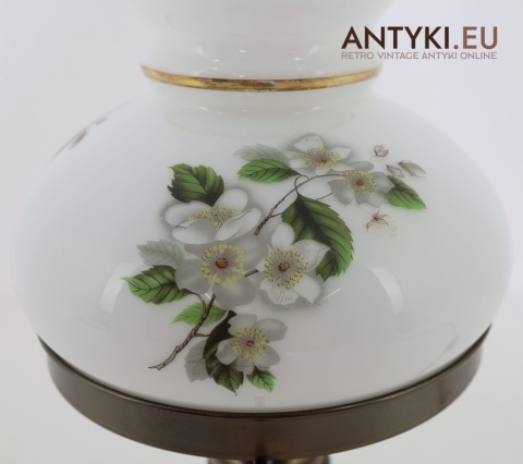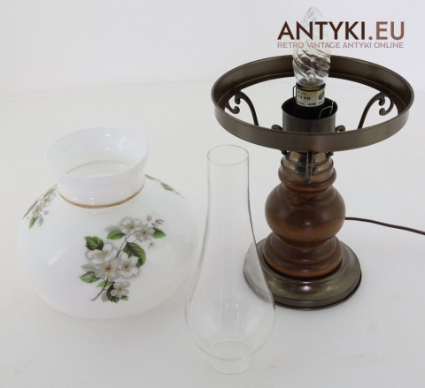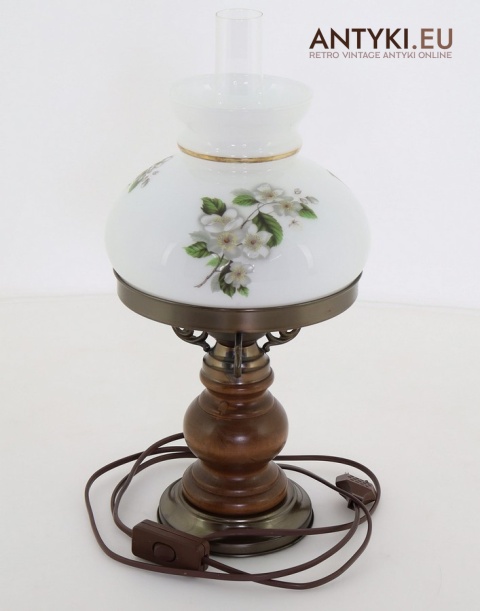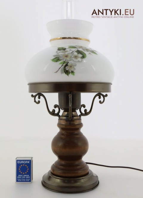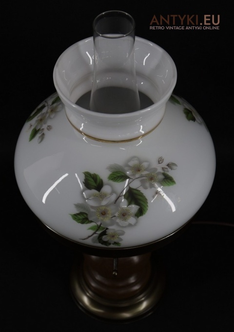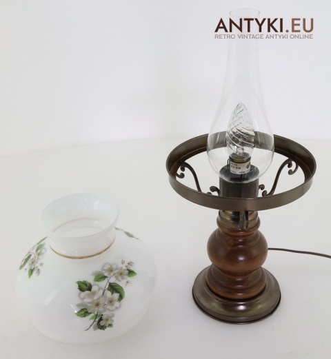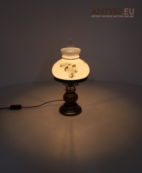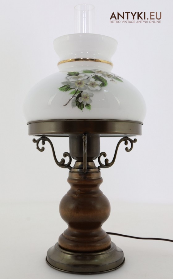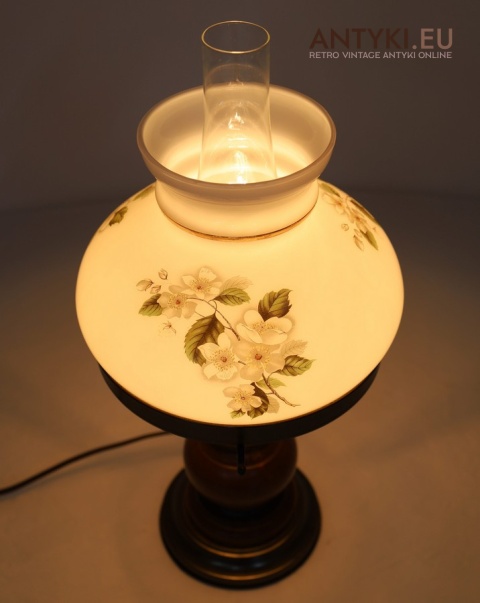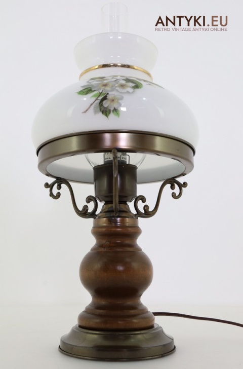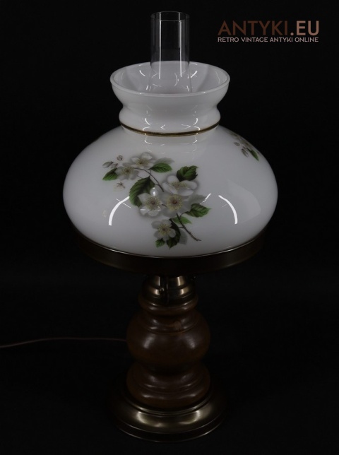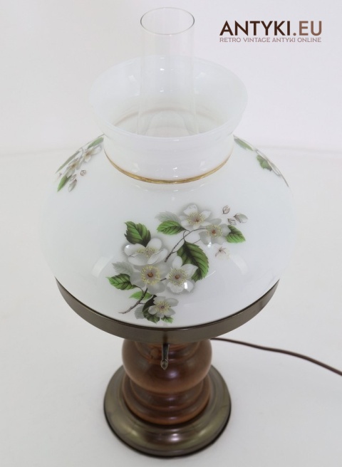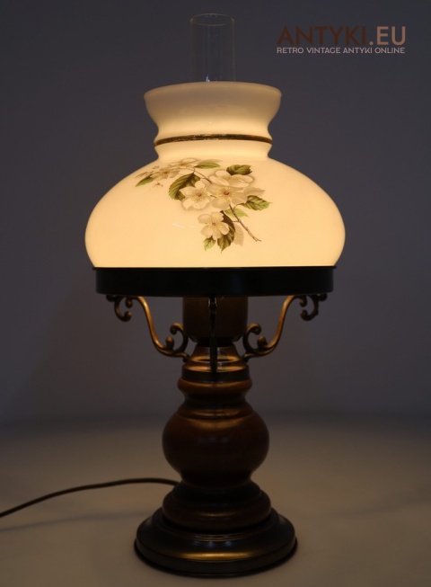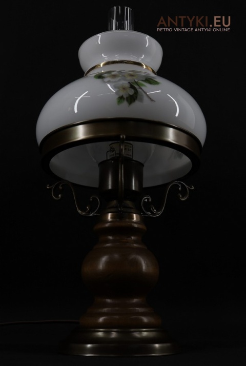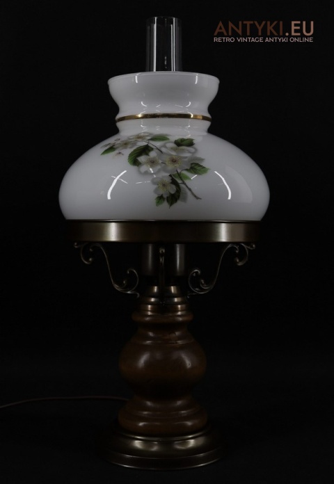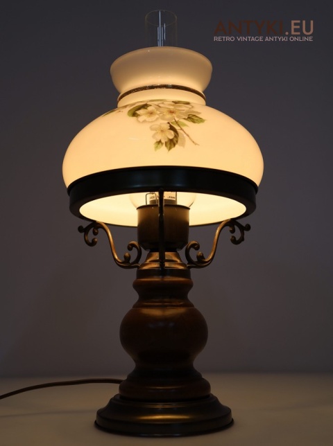 Podstawę wykonano z litego drewna o pięknej, naturalnej fakturze, uzupełnionego elementami z mosiądzu. Główną ozdobą lampy jest duży szklany, mleczny klosz z motywem kwiatowym oraz charakterystyczny szklany przezroczysty komin, nawiązujący do tradycyjnych lamp naftowych. Całość prezentuje się niezwykle efektownie, oferując subtelne i przytulne światło.