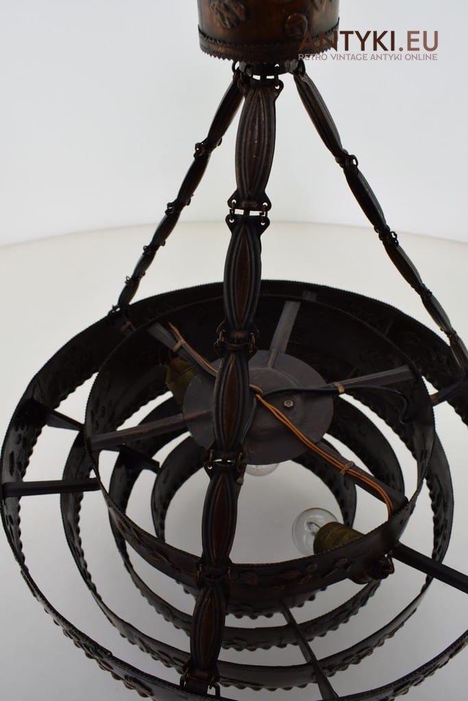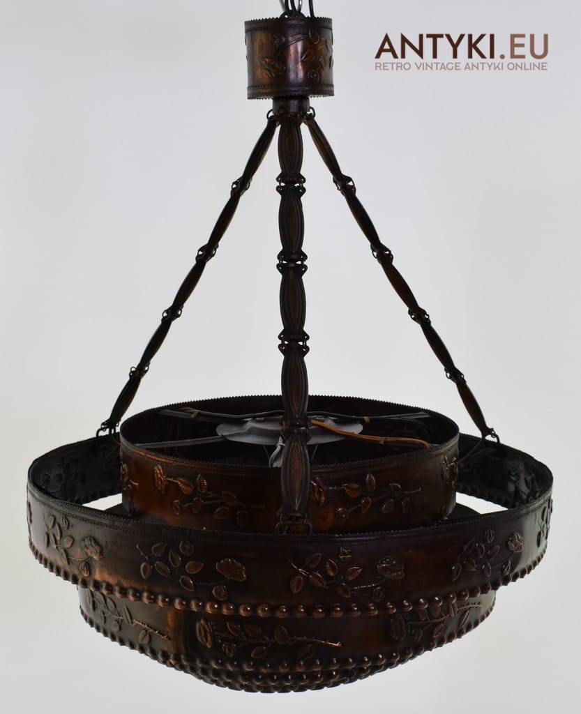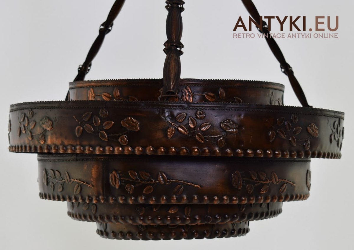 Okrągły miedziany żyrandol. Lampa sufitowa z tłoczonymi różami.