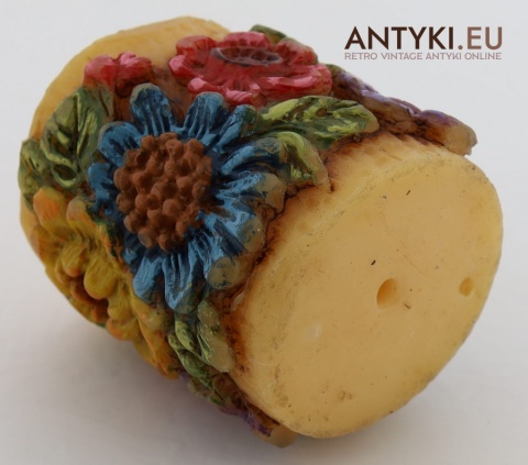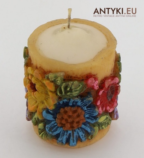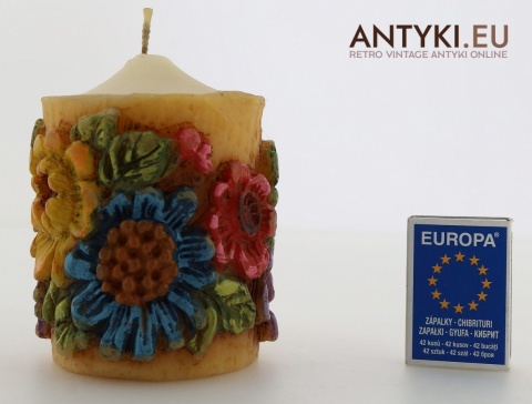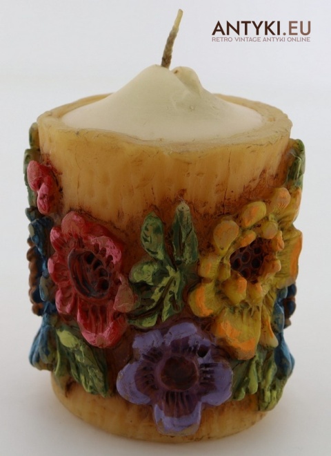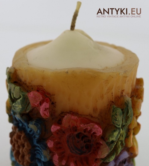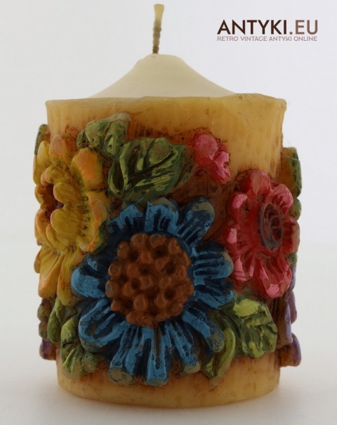 Przedstawiamy urokliwą świecę dekoracyjną pochodzącą z lat 60/70 XX wieku, wykonaną z wosku z niezwykłą precyzją i dbałością o detale. Jej powierzchnię zdobią wypukłe, barwne kwiatowe motywy, charakterystyczne dla stylu boho vintage, który w dzisiejszych czasach wraca do łask jako wyraz artystycznej wolności i naturalnego piękna.