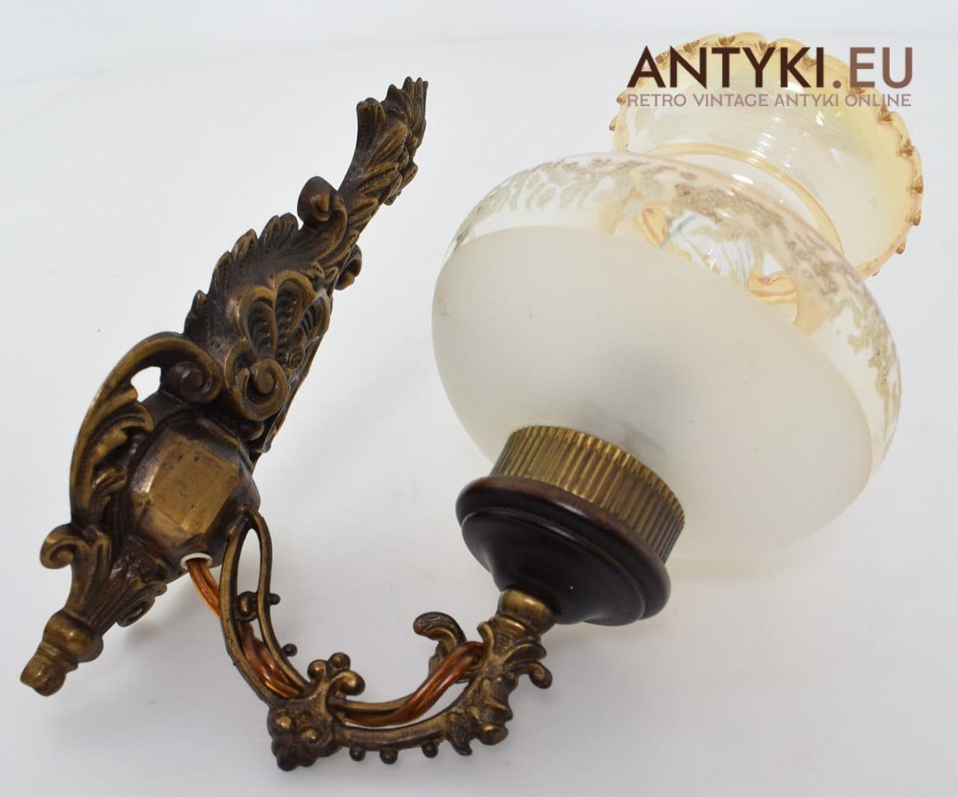 Sprowadzony z Austrii stary kinkiet pochodzi z lat 1960 / 70.  Klosz wykonany z masywnego szkła na górze zwieńczony falbaną. Dolna część klosz matowa, a  na środku klosze abstrakcyjne paski. Ramię kinkietu wykonane z masywnego odlewu mosiężnego o pięknych kwiatowych wzorach używanych w stylu secesyjnym i rustykalnym.  Z tyłu rozety przylegający do ściany jest specjalna zawieszka do montażu ściennego. Stara lampka w bardzo dobrym stanie bez uszkodzeń mechanicznych. Kompletna. Elektryka sprawna. Standardowa żarówka typu E14 o maksymalnej mocy 60 Watt. Wszystkie kinkiety i lampy wysyłamy bez żarówek.