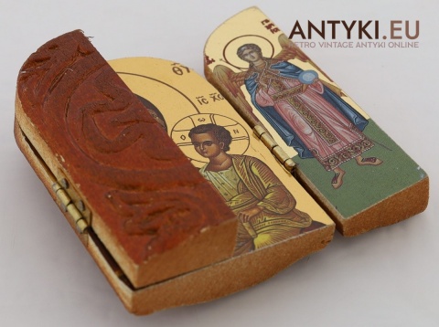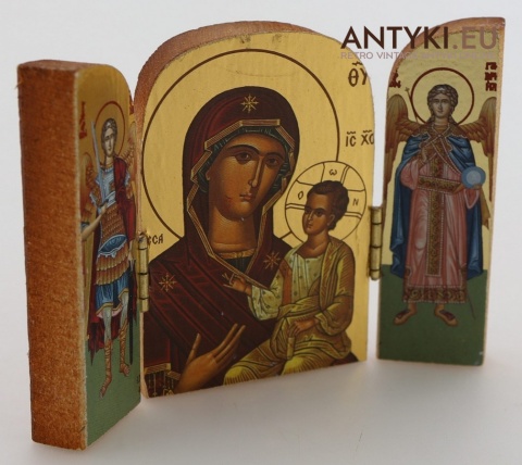 🕊️ Starodawny drewniany tryptyk podróżny – ikona Matki Boskiej z Dzieciątkiem i Archaniołami