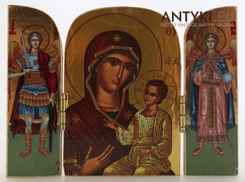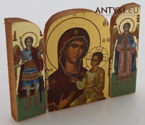 Bizantyński triptyk podróżny, środkowa część z Matką Boską z Dzieciątkiem, boczne – Archanioł Michał (z mieczem) i Gabriel (z lilią lub dyskiem) – klasyczne postacie obronne i zwiastowalne. Przeznaczony do przenośnej modlitwy, pozwala otwierać boczne skrzydła i stworzyć mini-ołtarzyk w dowolnym miejscu.