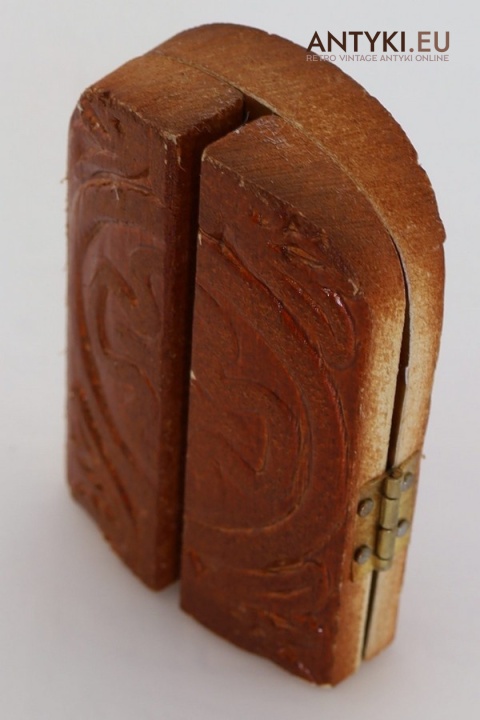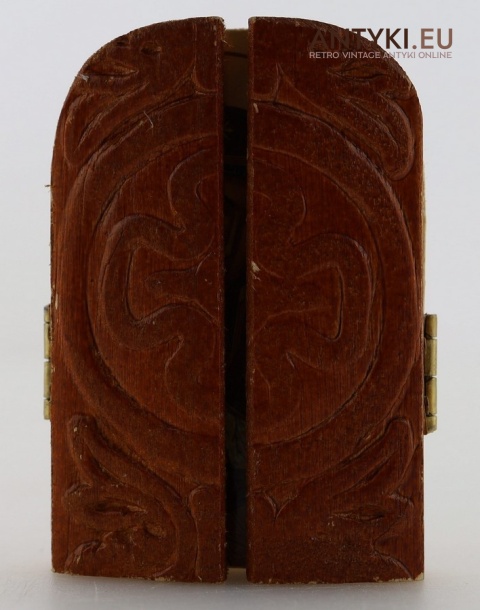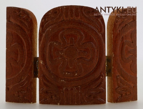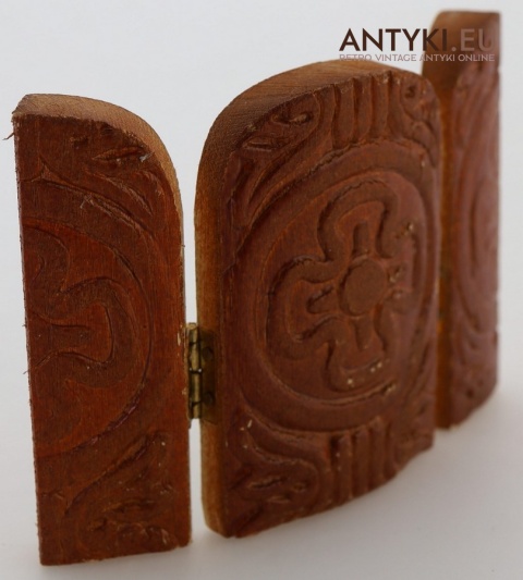 Wykonane z litego drewna – rzadko spotykany dziś jakościowy materiał, ceniony za trwałość i naturalny wygląd. Drewniane rzeźbienia z tyłu świadczą o ręcznym wykonaniu. Obecnie takie drewno i rękodzieło to luksus – wartość, którą docenią kolekcjonerzy i miłośnicy autentycznych antyków. Postacie na ikonie to nadruki.