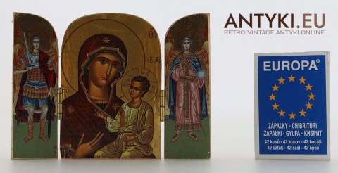 W stylu bizantyjskim – surowe formy, złote tło i wyraźne kontury ikon. Ten styl był modny od VI do XV wieku w cesarstwie bizantyjskim, z wpływami szerzącymi się po prawosławnych ziemiach. Dziś sprawdzi się doskonale we wnętrzach retro, medytacyjnych przestrzeniach, kaplicach domowych i modlitwie w podróży. Sprowadzony z Francji. Pochodzi z końca XX wieku.