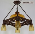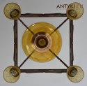 Jedna z perełek naszego sklepu z antykami. Wyjątkowo piękny żyrandol w rasowym stylu rustykalnym. Ciekawostka: Słowo Rustykalny (rustykalna, rustyk) oznacza - chłopski, ludowy, kmiecy, wiejski, plebejski, wsiowy, ruralistyczny, włościański, wieśniaczy... Wykonany z litego drewna. Klosze szklana o kolorze żółtym w formie florystycznej. Duży szklany klosz ma pod spodem ozdobną miedziowaną opaskę - co widać na fotkach. Lampy tego typu pasują do różnych aranżacji wnętrz, zaczynając od klasycznych pomieszczeń, kończąc na ekskluzywnych wnętrzach. Staromodny żyrandol będzie pasował nad stolik w pubie jak i świetnie się odnajdzie w retro salonie. Wszystko to kwestia gustu i wyobraźni, ale jedno jest pewne - ten żyrandol oczaruje każdego kochającego ciepły wystrój wnętrz. Prawdziwa gratka dla wymagających koneserów staroci i piękna!!!