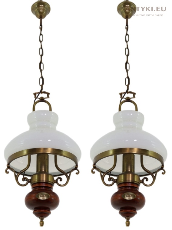 Stylowa lampa wisząca wykonana z masywnego mosiądzu, litego drewna oraz szkła mlecznego, zachowana w bardzo dobrym stanie. To oryginalne retro oświetlenie z epoki, które świetnie oddaje klimat dawnych wnętrz i klasycznego rzemiosła.