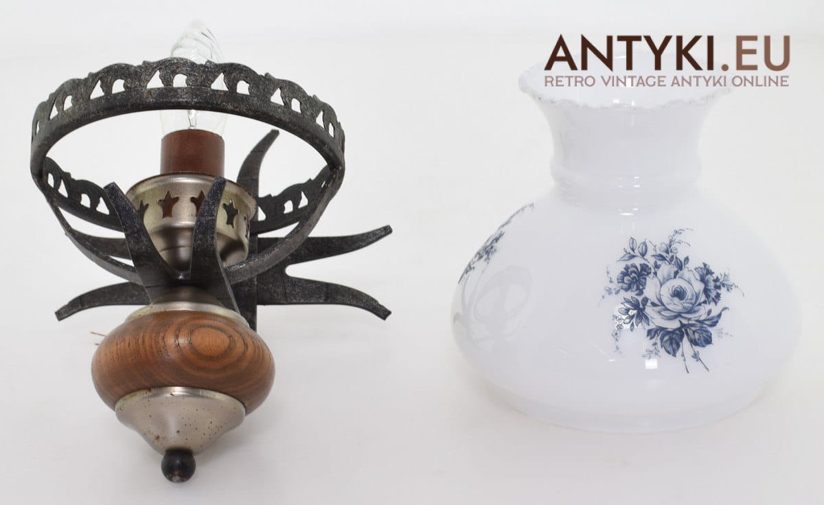 Bardzo dekoracyjne w ciepłym klimacie stare lampki wykonane z kutego metalu, litego drewna + szklany klosz z kwiatowymi wzorkami. Kinkiety nadają się do różnych aranżacji wnętrz, zaczynając od kuchni rustykalnej, korytarz, łazienki w rustykalnym stylu i tak dalej. Kwestia pomysłów...