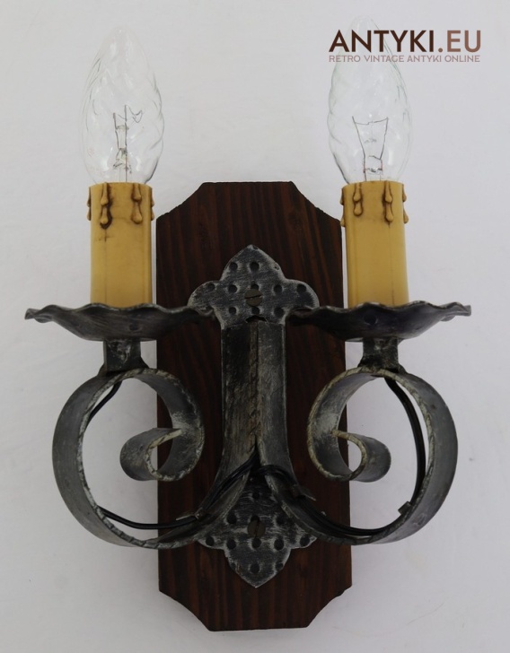 Takich solidnych materiałów jak lite drewno i ręcznie kuty metal nie stosuje się dziś powszechnie ze względu na wysokie koszty – dzięki temu ten egzemplarz ma niepowtarzalną wartość. Kinkiet sprowadzony z Francji, oryginalny i kompletny, gotowy do dekoracji wnętrz w klimacie dworkowym, wiejskim, góralskim czy retro.