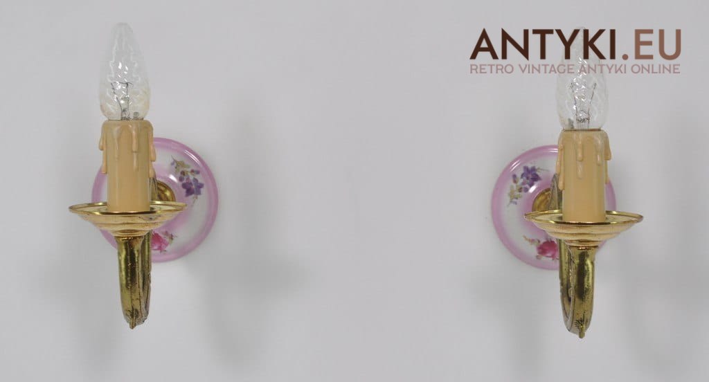 Stare kinkiety wykonane z mosiadzu i metalu mosiadzowanego + ceramiczne rozety przylegajace do sciany . Na czesciach z mosiadzu widac znaki starosci , nalot/patyne itd .  Bez uszkodzen . Kompletne . Elektryka sprawna - sprawdzana . Stan bardzo dobry .