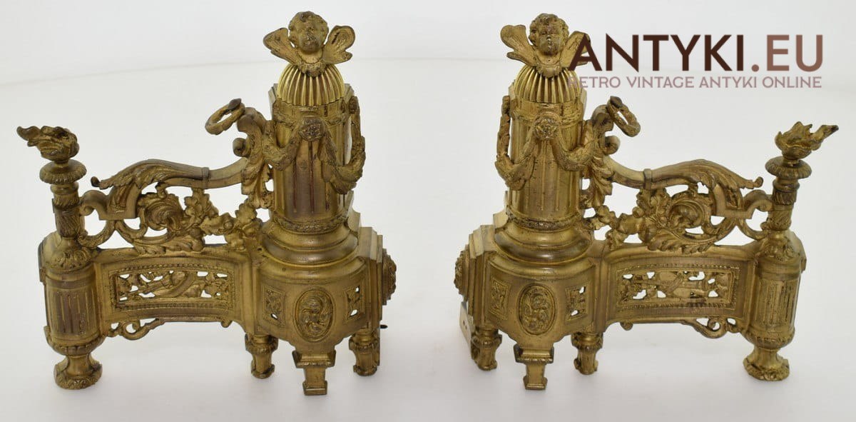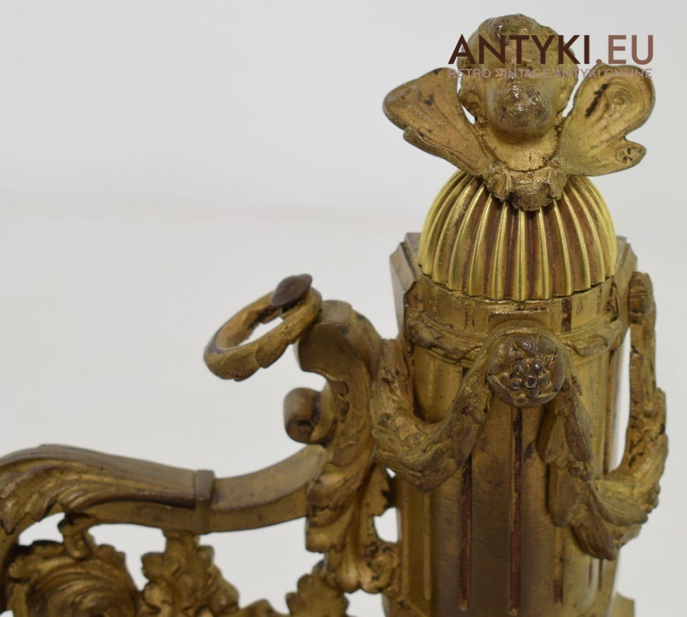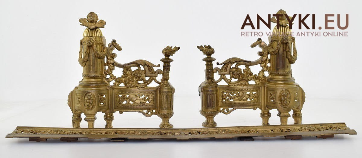 Stan idealny. Między 2 wieżyczkami z aniołkami, jest listwa która która jest regulowana - co widać na zdjęciach. Pasuje do różnych rozmiarów kominków.