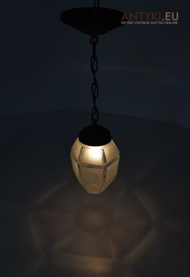 Zachowana w bardzo dobrym stanie, zabytkowa lampa pochodzi z okresu Art Deco / secesji.  Klosz nie popękany, nie klejony. Łańcuch i rozeta oryginalne. Jedyne co zmieniliśmy to oprawka na żarówkę E27, bo oryginalna była już wysłużona i mogłoby dojść do zwarcia.
