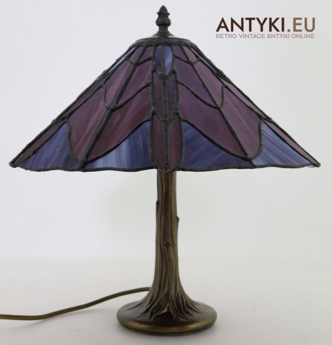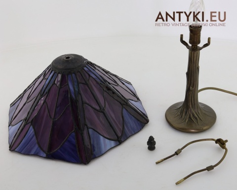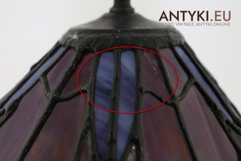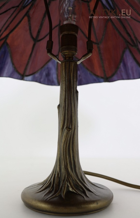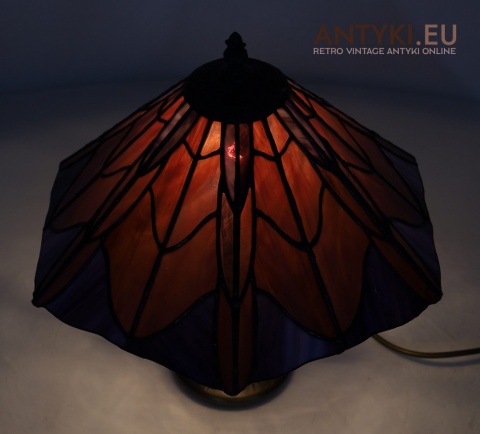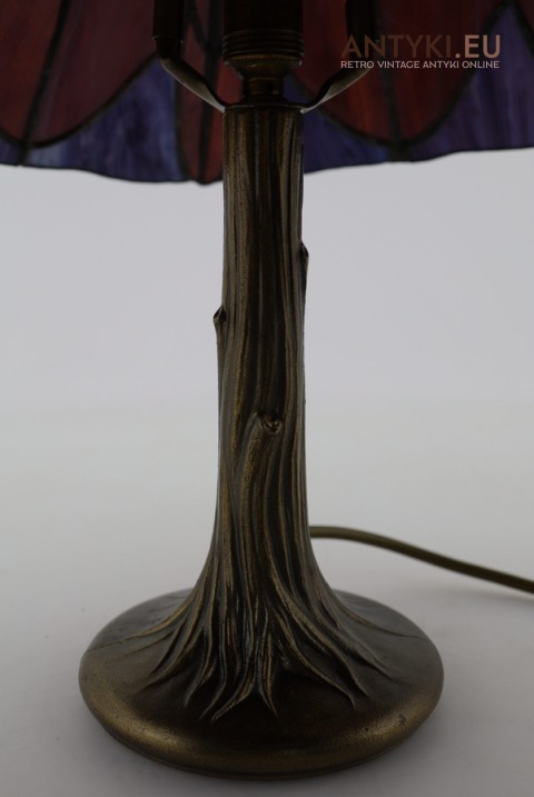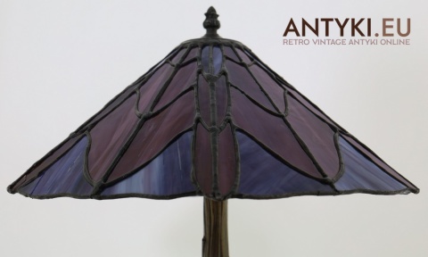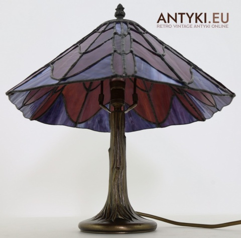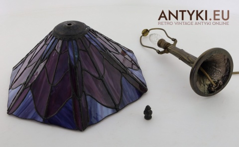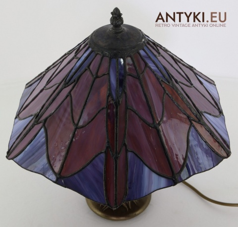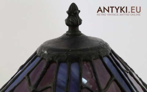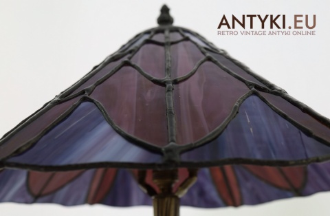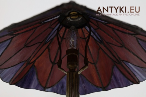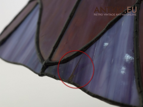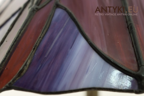 Materiał klosza: Ręcznie lutowane szkło opalizujące typu Tiffany (barwy: fiolet, burgund, błękit)