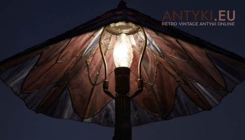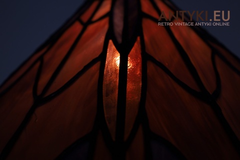 Klosz wykonany został w tradycyjnej technice Tiffany – każdy kawałek szkła został ręcznie wycięty, oprawiony w taśmę miedzianą i przylutowany, tworząc zachwycający wzór o zmiennych kolorach w zależności od oświetlenia. W wieczornym świetle lampa daje ciepłą, nastrojową poświatę.