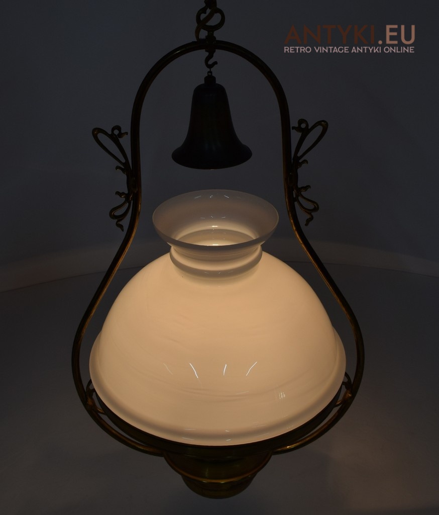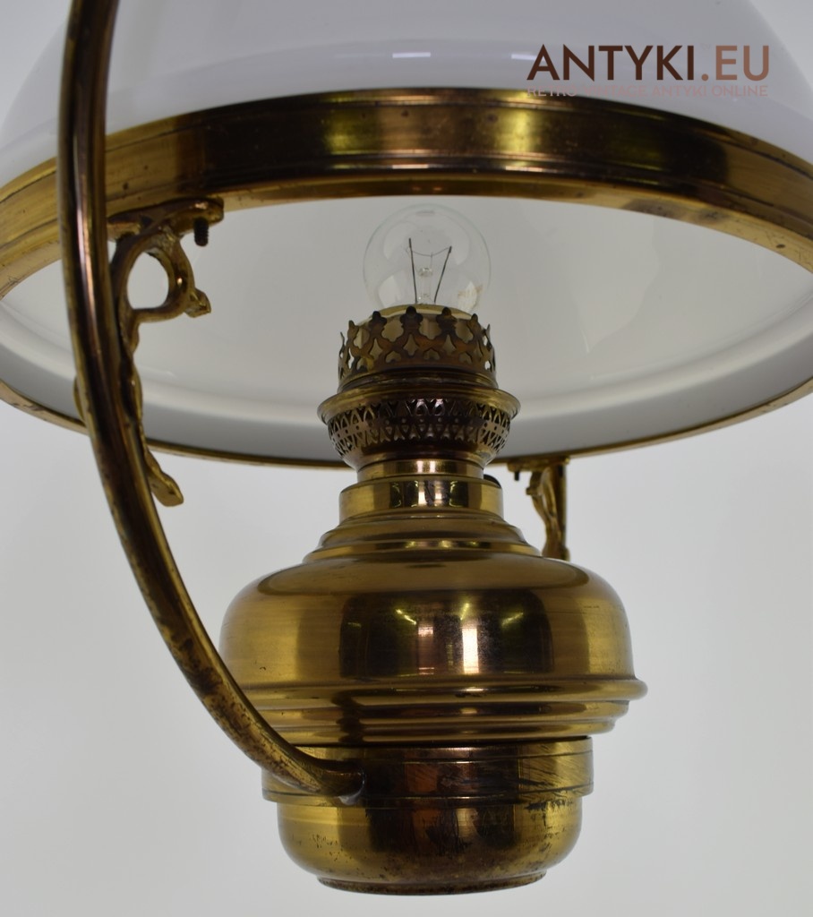 Starodawna lampa wisząca, przerobiona z naftowej na elektryczną.