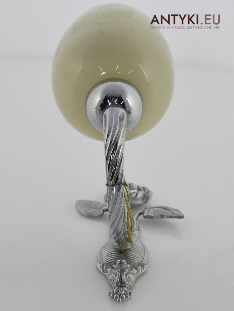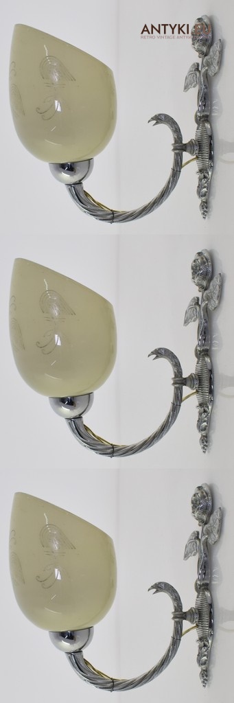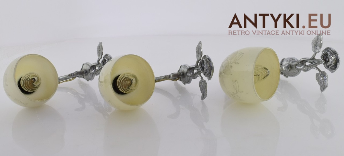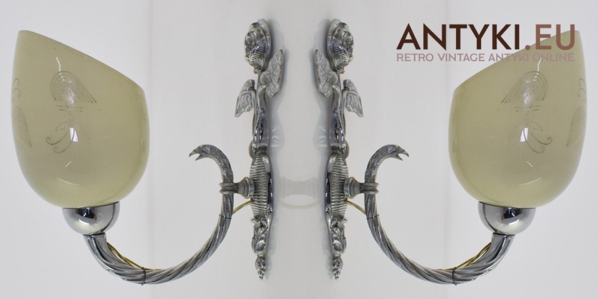 Starodawne małe srebrne kinkiety z żółtymi kloszami.