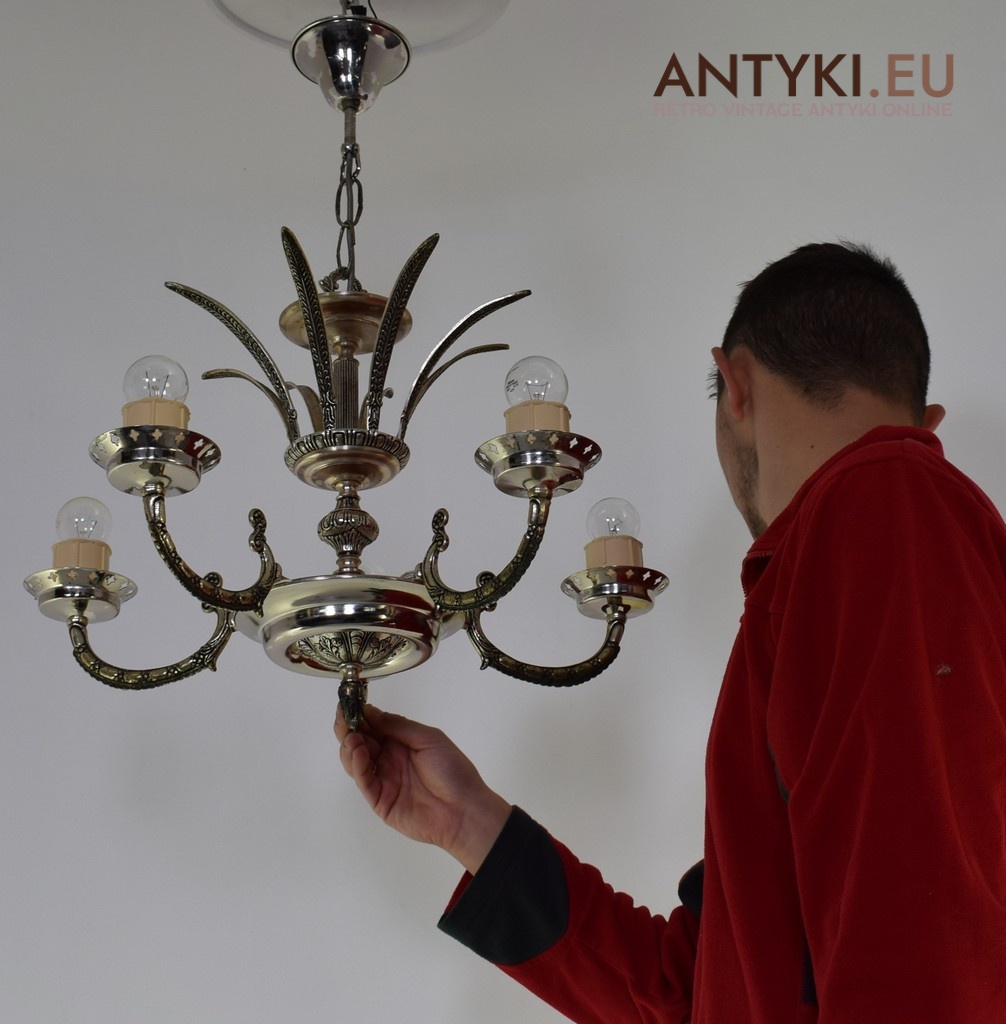 Całość bez uszkodzeń, kompletna. Elektryka sprawna. Standardowe gniazda typu E27 o maksymalnej mocy 80 watt. Wszystkie lampy wysyłamy bez żarówek. W dzisiejszych czasach można kupić żarówki LEDowe o różnej barwie światła, o różnym natężeniu i o różnym kształcie. Więc tak na prawdę malutka żarówka może być potężnej mocy i nie pobierać wielu wattów, przez co nie spali lub nie przegrzewa kabli elektrycznych.