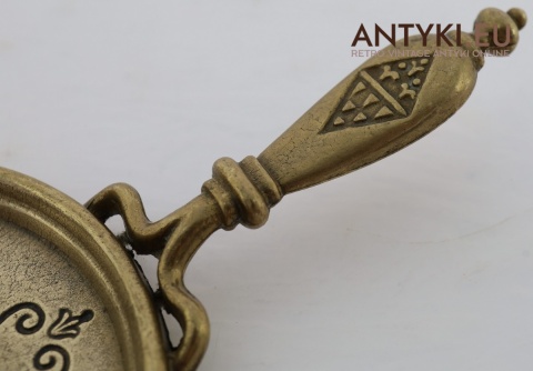 Przedstawiamy oryginalny, przenośny świecznik wykonany w całości z masywnego mosiądzu, pochodzący z połowy XX wieku. Ten stary świecznik retro charakteryzuje się wyjątkowym kształtem z ozdobnym uchwytem, który ułatwia przenoszenie i dodaje mu elegancji. Na powierzchni znajduje się delikatny, dekoracyjny grawer, który podkreśla jego antyczny charakter.