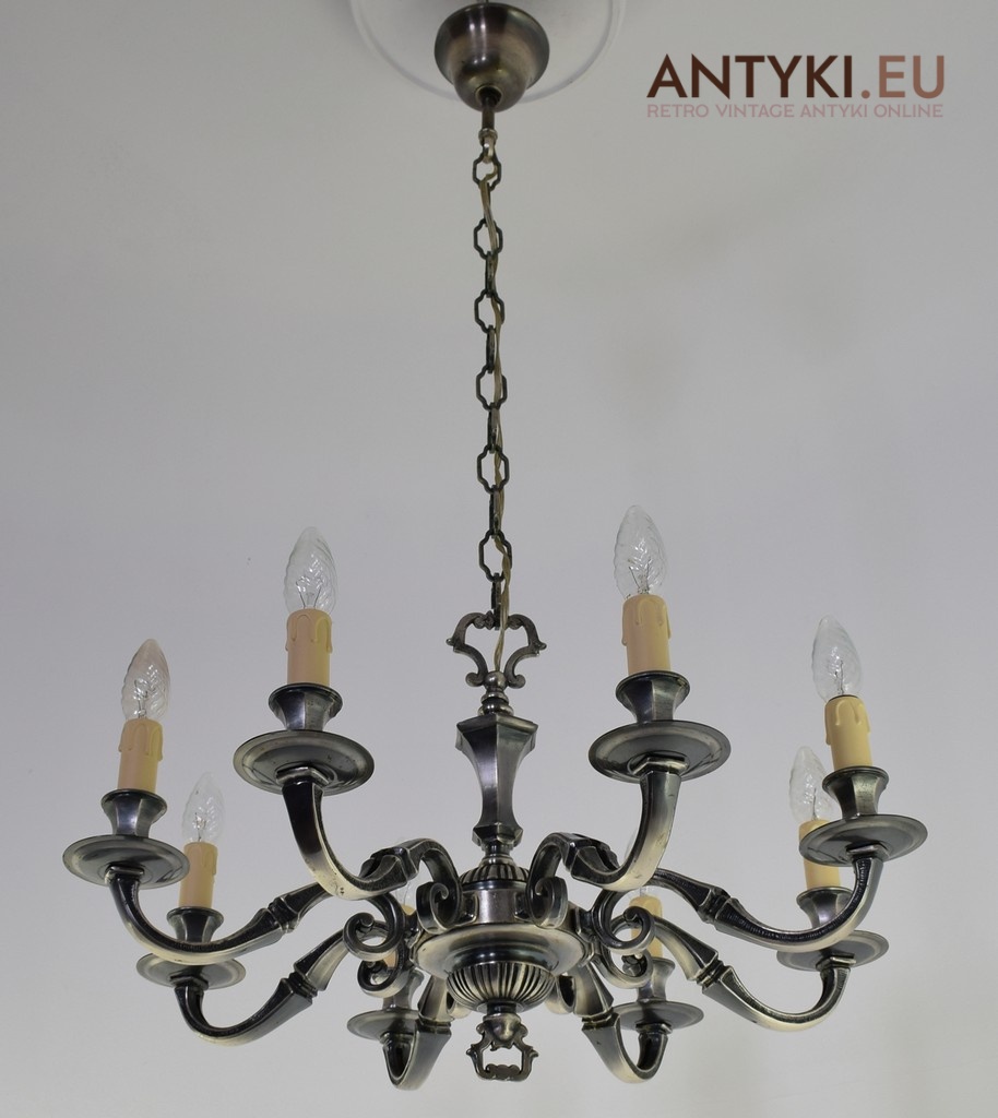 Stary żyrandol salonowy o ciemnym srebrnym kolorze.
