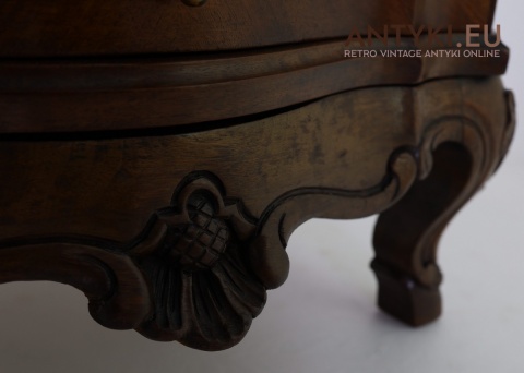 Przedstawiamy wyjątkową, starą szafkę nocną w stylu Ludwika XV, sprowadzoną prosto z Francji. Mebel pochodzi z lat 1920–1940 i wykonany jest z litego drewna orzechowego oraz pięknej, fornirowanej płyciny z bogatą intarsją na blacie. Charakterystyczne dla stylu są miękkie linie, gięte nogi typu cabriole oraz ozdobne detale rzeźbiarskie.