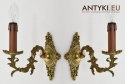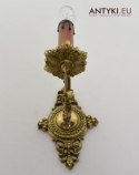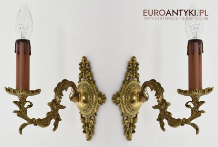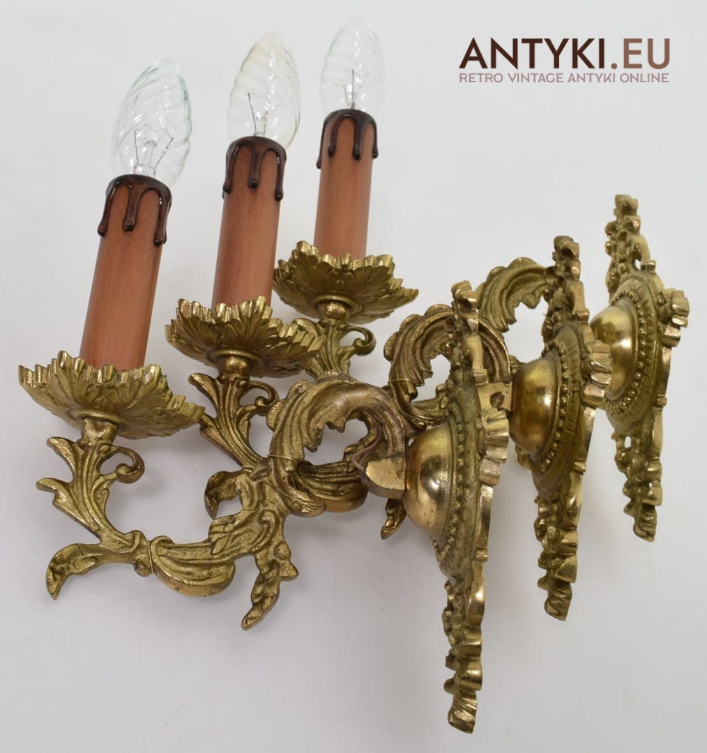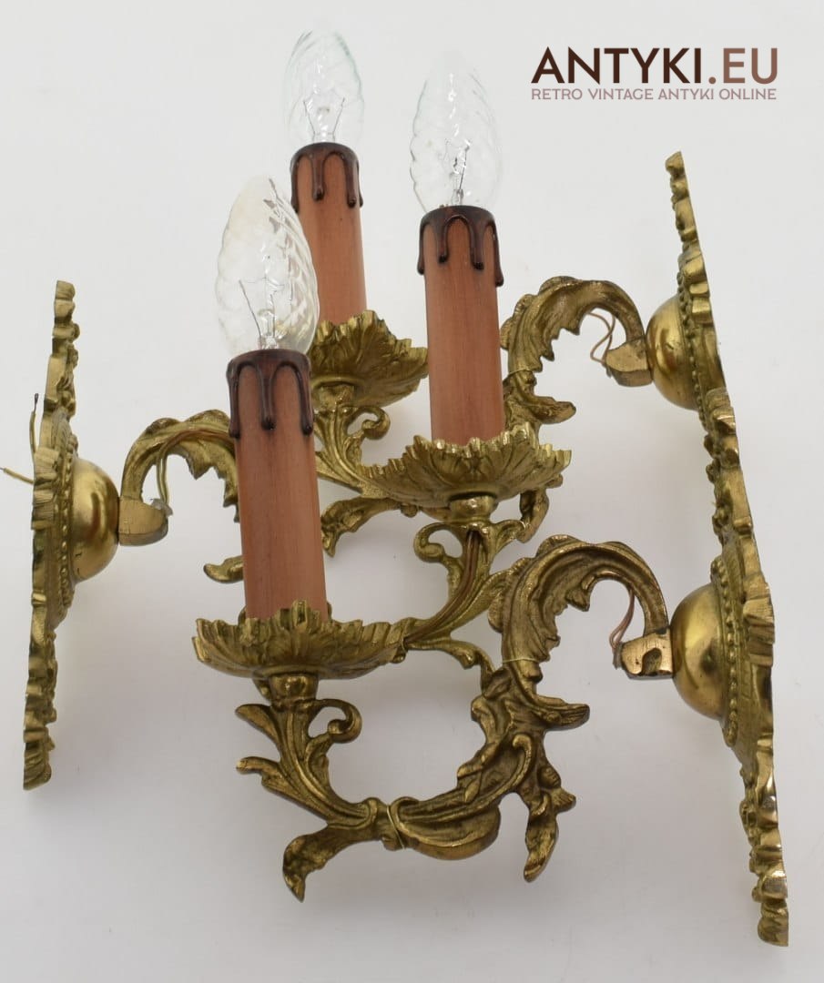 Zabytkowe kinkiety wykonane z masywnych odlewów mosiężnych. Waga 1 sztuki to 0,7kg!!! Pochodzą z lat 1950-60.