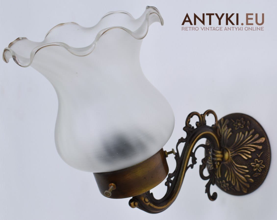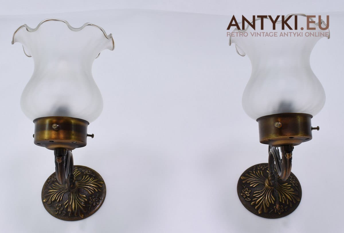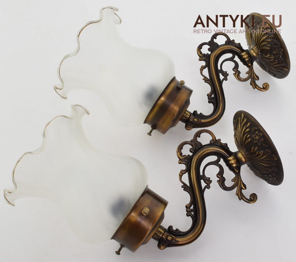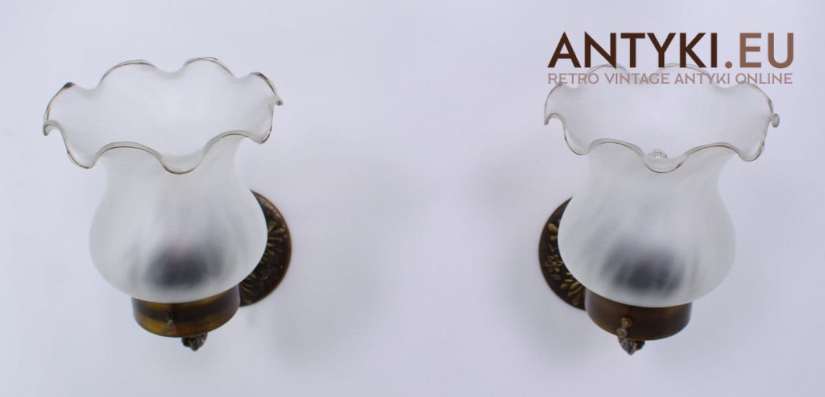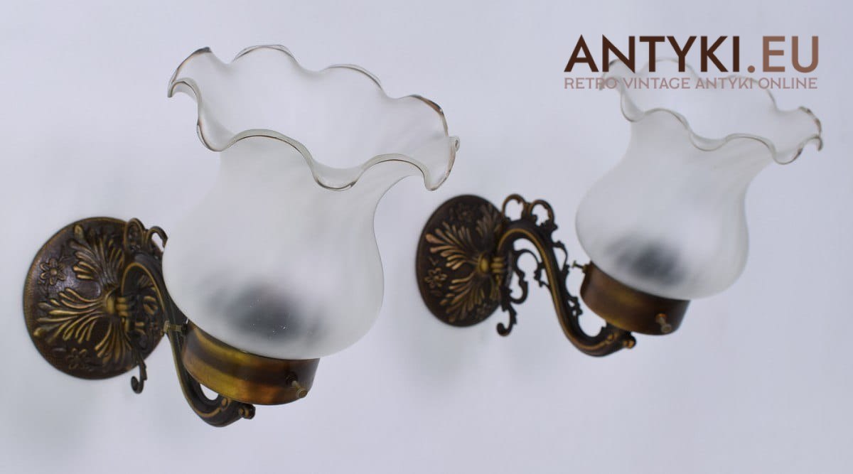 Bardzo solidne i ładne, stare kinkiety pochodzą z lat 1960. Wykonane z odlewów mosiężnych i szklanych kloszy. Klosze i ramiona w formie florystycznej. Z tyłu rozetek przylegających do ściany jest specjalna zawieszka na montaż ścienny.