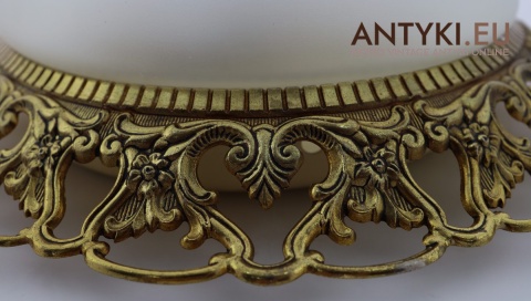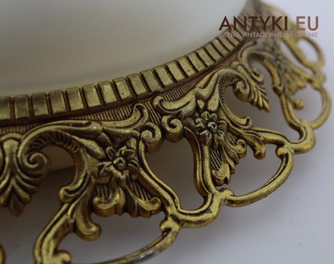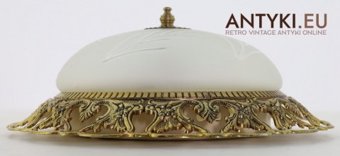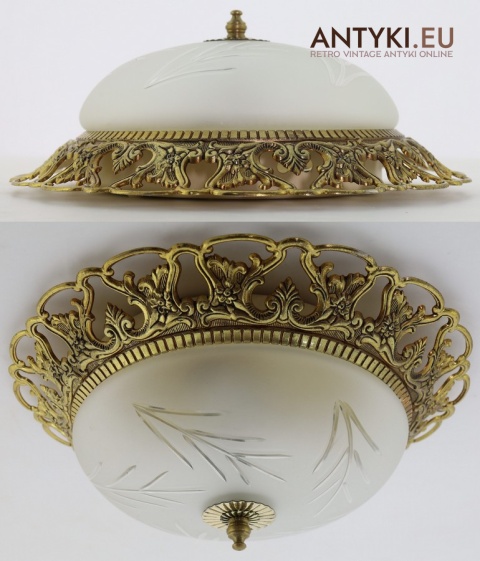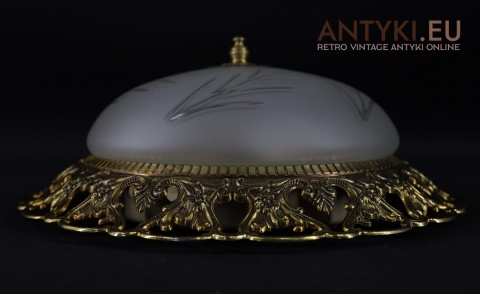Przedstawiamy stary, antyczny plafon sufitowy w stylu Ludwikowskim, pochodzący z Francji, datowany na lata 1970. Plafon wykonany jest z dekoracyjnie mosiądzu oraz posiada piękny, szlifowany szklany klosz w idealnym stanie – bez jakichkolwiek uszkodzeń czy pęknięć. Całość zachowana w bardzo dobrym stanie, bez żadnych ukrytych wad.