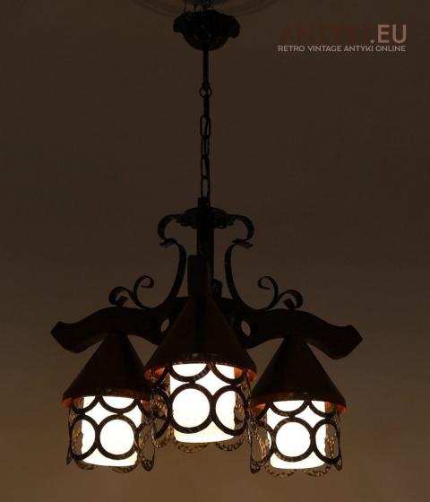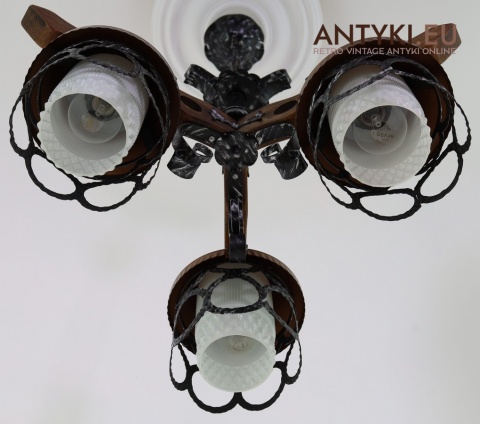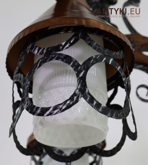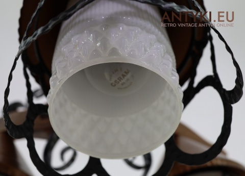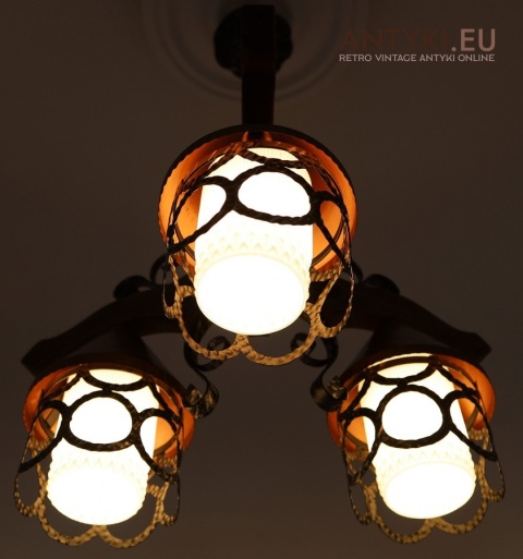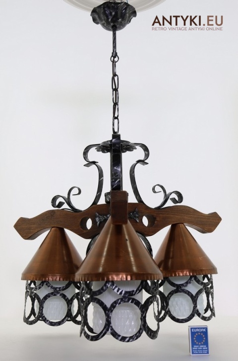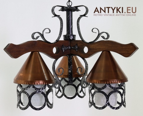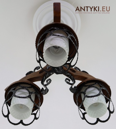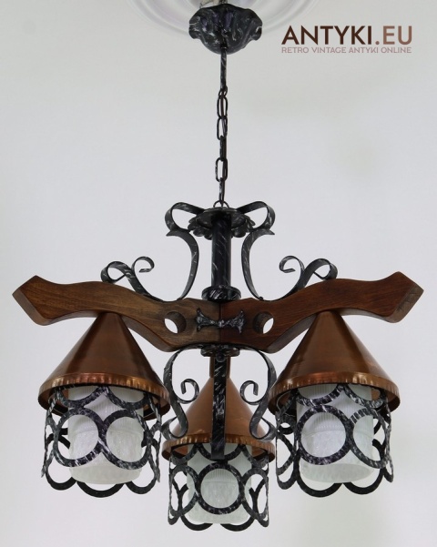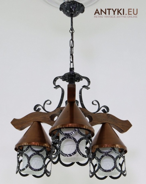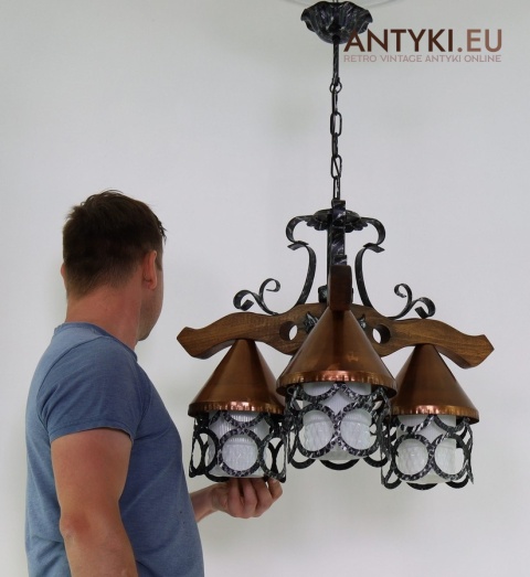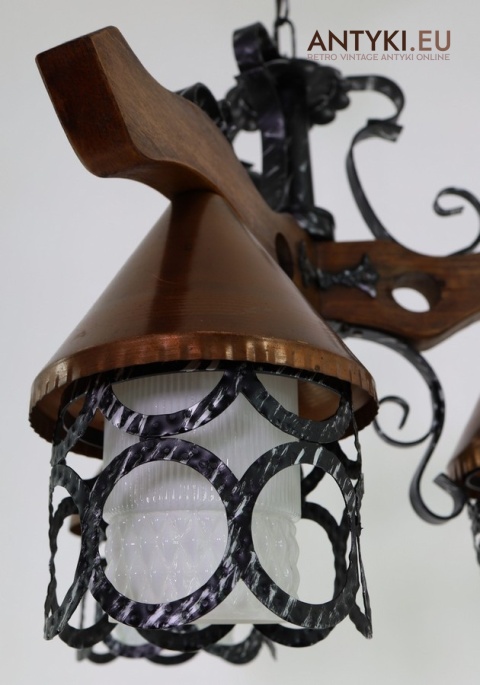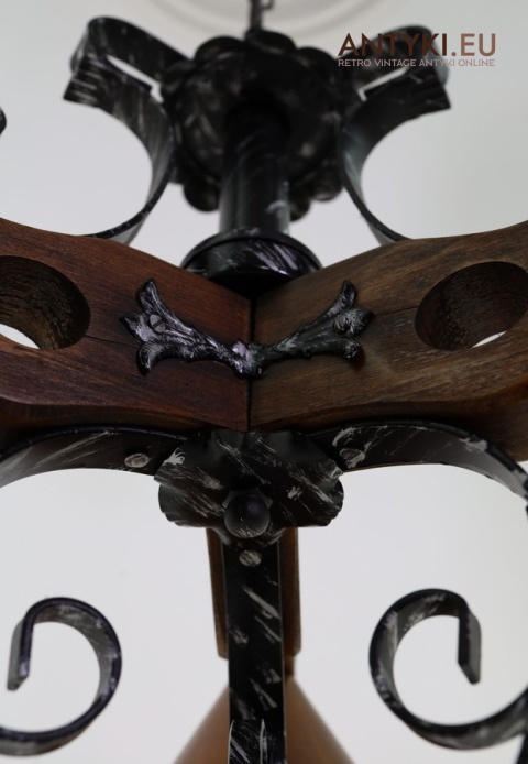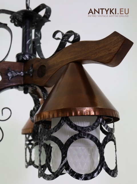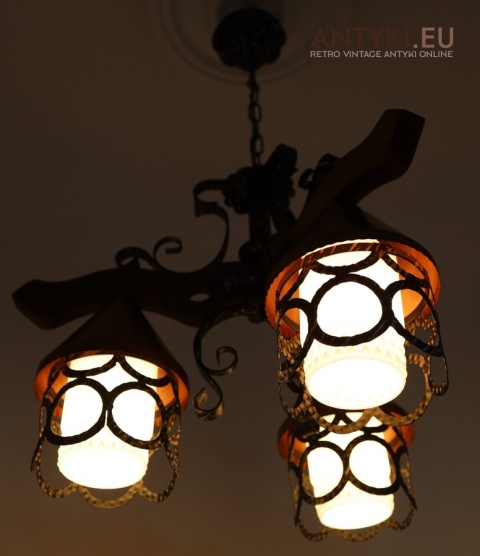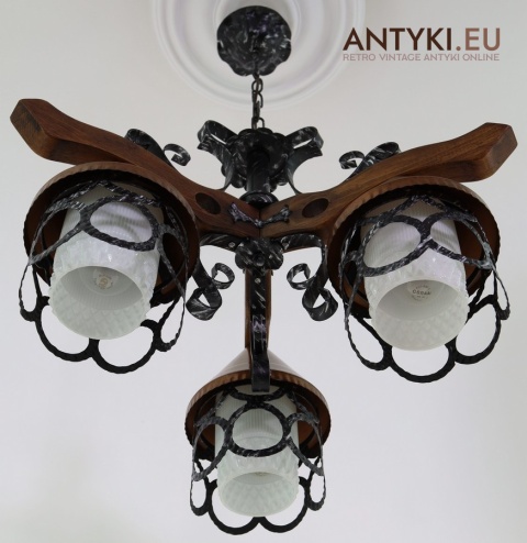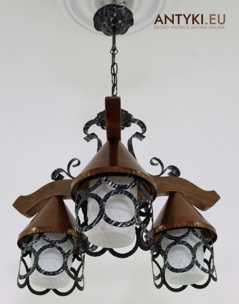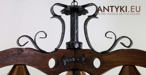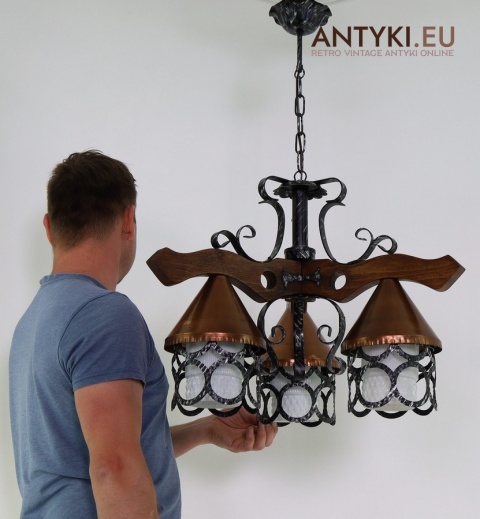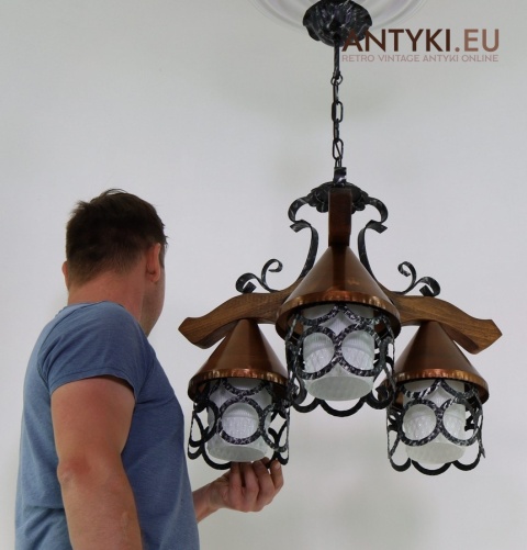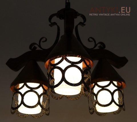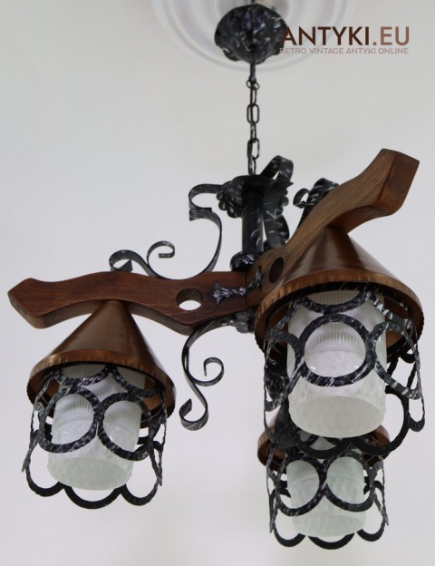 Przedmiotem tej oferty jest oryginalny, stary żyrandol rustykalny sprowadzony z Francji, wykonany z litego drewna, żelaza oraz dekoracyjnych szklanych kloszy. Styl lampy nawiązuje do rustykalnych tradycji z lat 60./70. XX wieku, łącząc w sobie ciepło naturalnego drewna z metalem i szkłem. Tego typu oświetlenie było popularne we wnętrzach dworkowych i górskich, dziś wraca do łask jako unikatowy akcent w aranżacjach retro, vintage oraz boho 🌿