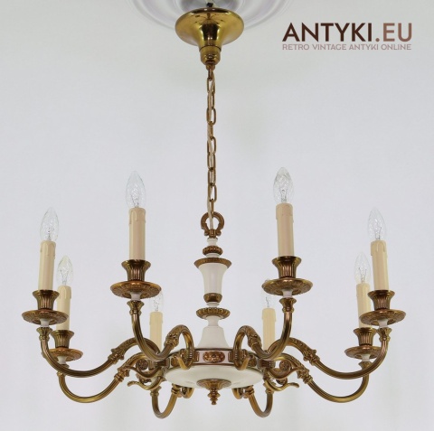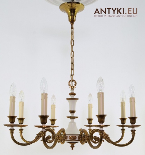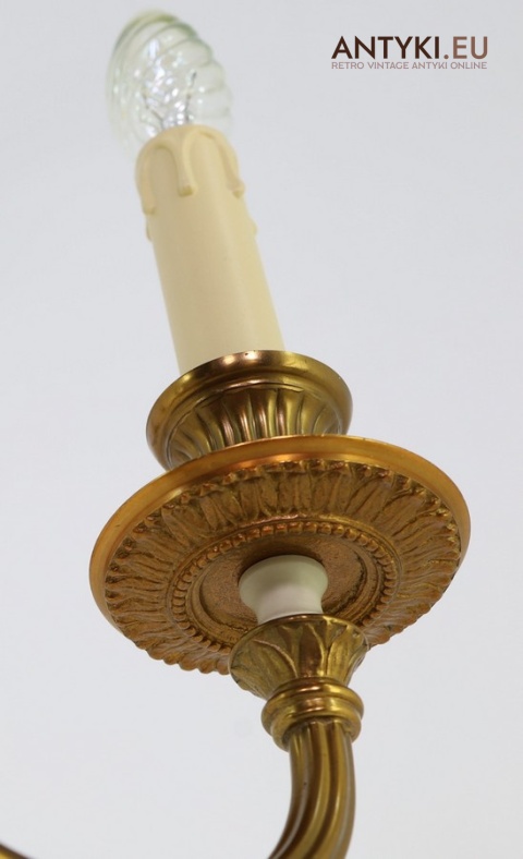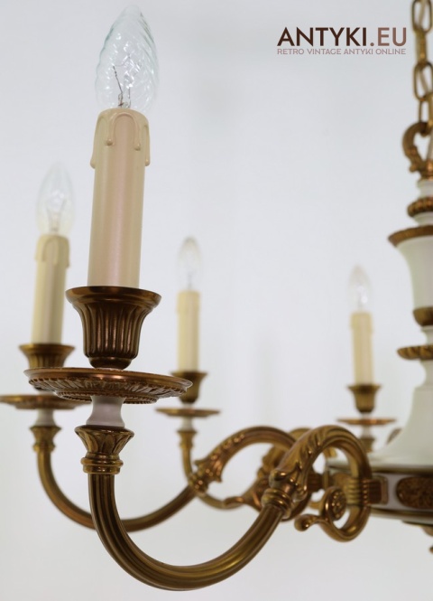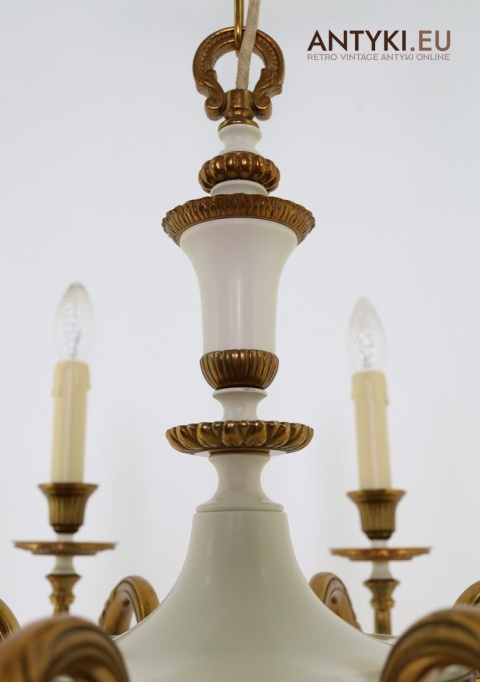 Przedstawiamy niezwykle dekoracyjny i masywny żyrandol w stylu Empire, sprowadzony bezpośrednio z Francji, datowany na lata 50./60. XX wieku. Ten wspaniały, ośmioramienny model to esencja klasyki i elegancji, idealna do wnętrz urządzonych z rozmachem i wyczuciem stylu. Uwagę przykuwaj kunsztownie zdobione ramiona, pokryte powłoką w kolorze „prawdziwego ciemnego złota”, z detalami kwiatowymi oraz centralną częścią i drobnymi dodatkami w tonacji ecru.