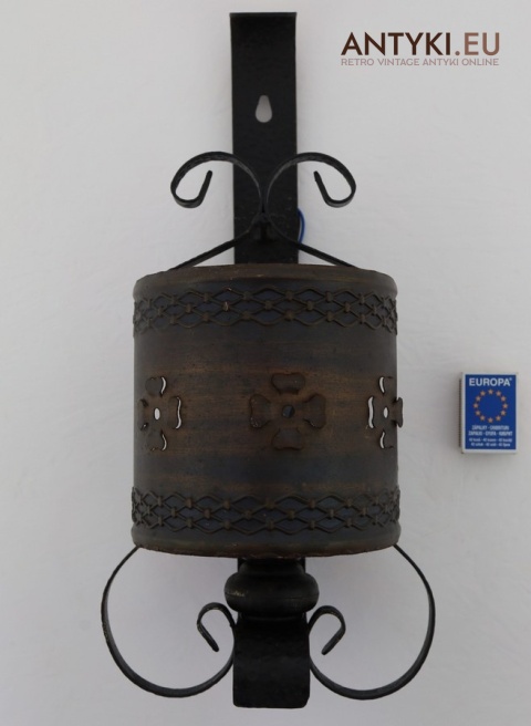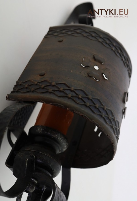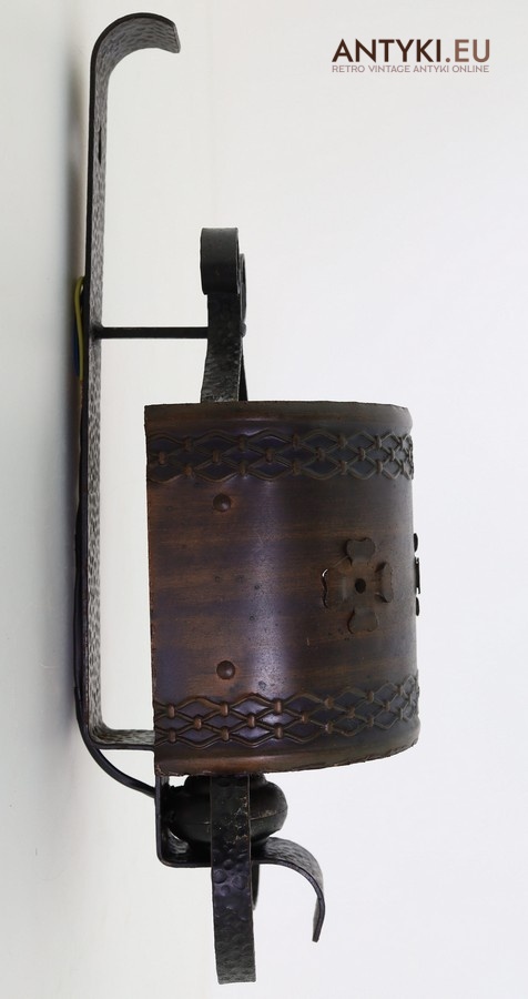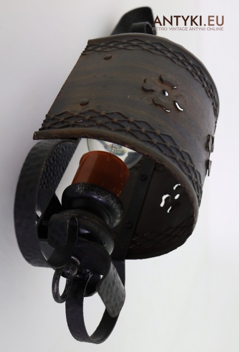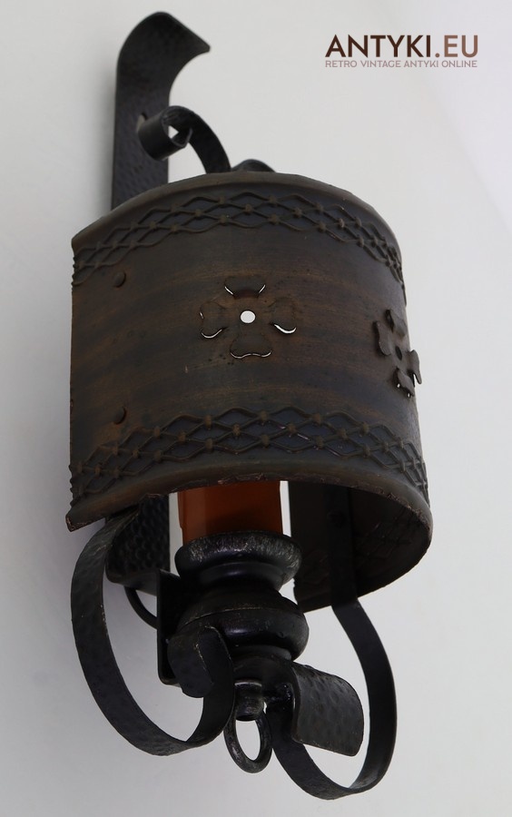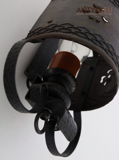Przedstawiamy unikalny, stary kinkiet ścienny z metalu, który zachwyca ręcznym wykonaniem i rustykalnym charakterem. Ten egzemplarz to oryginalna lampa z końca XX wieku (lata 70-80.), idealna dla miłośników stylu retro, vintage i wiejskiego romantyzmu.