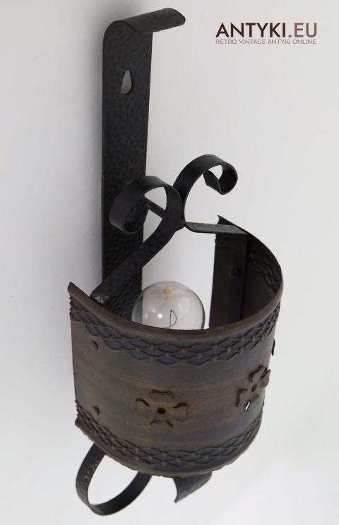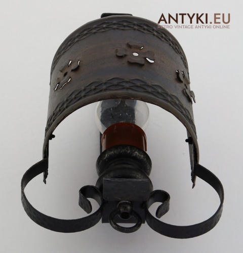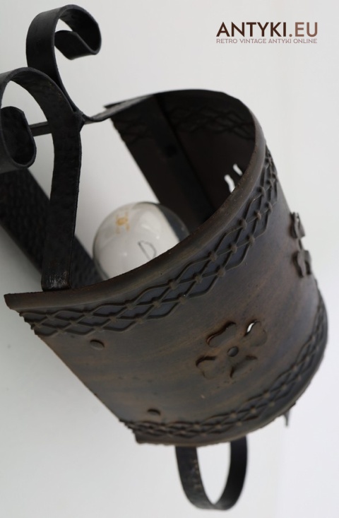 Ten kinkiet wykonany został we Francji, w stylu rustykalnym, który łączy prostotę wiejskiej elegancji z kowalską solidnością. Tego typu wzornictwo było bardzo popularne w latach 70. i 80. XX wieku, szczególnie we wnętrzach urządzanych na modłę prowansalską, hiszpańską czy góralską.