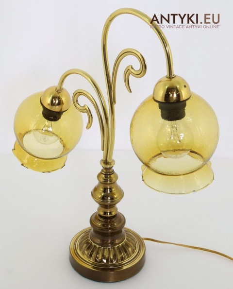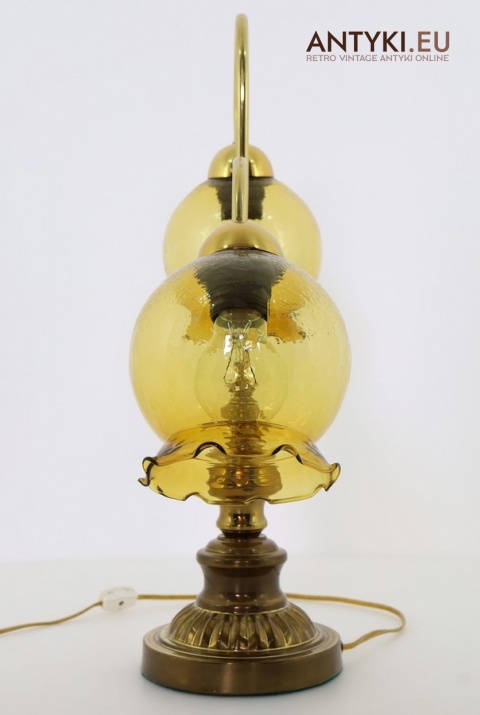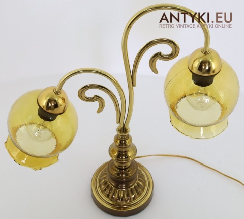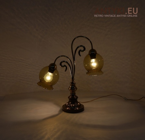 Ta duża stara lampa stołowa z masywną, elegancko zdobioną podstawą i dwoma pięknymi szklanymi kloszami w bursztynowym kolorze to prawdziwa ślicznotka z lat 1960-1970. Jej design wpisuje się w klasyczny styl retro, który łączy elegancję z przytulnym klimatem – to wciąż bardzo modny wybór, który nada wnętrzu charakteru i ciepła ✨.