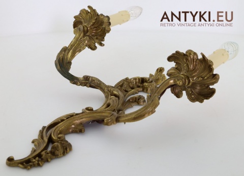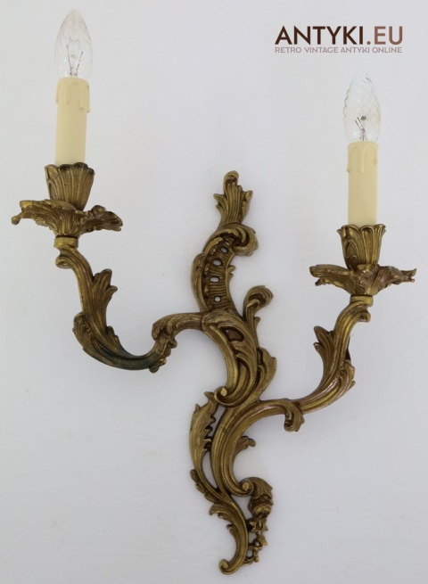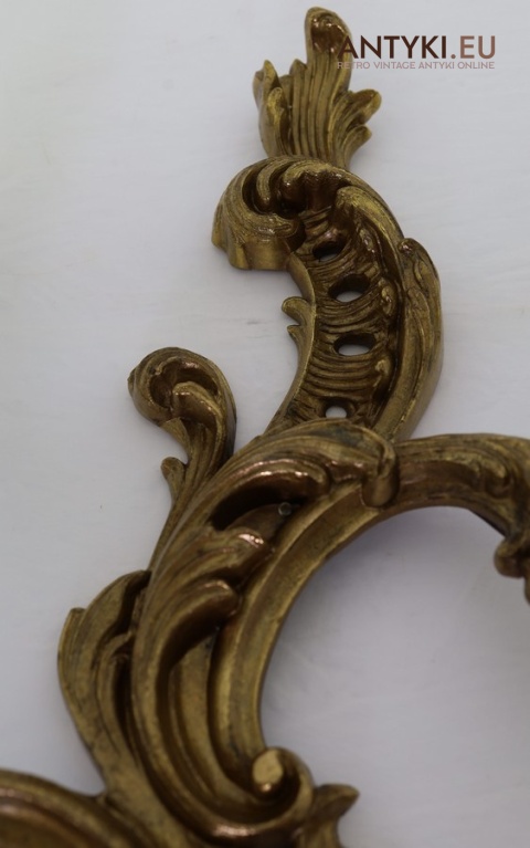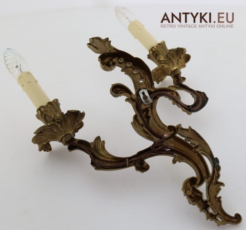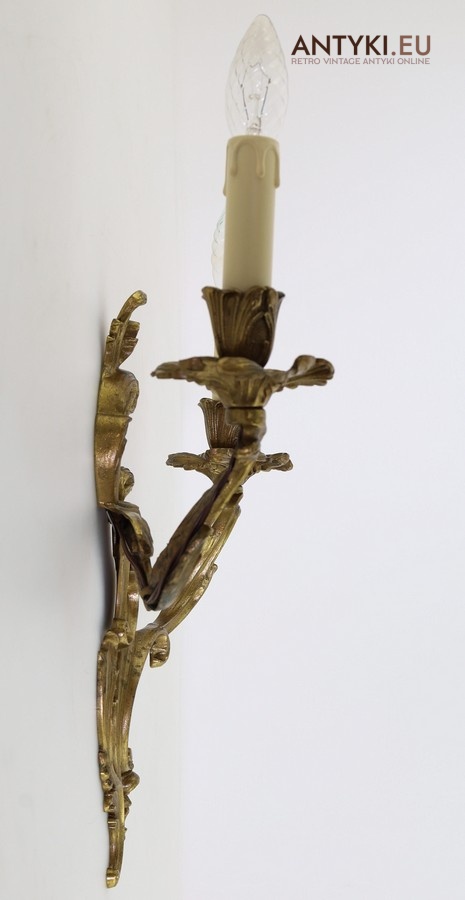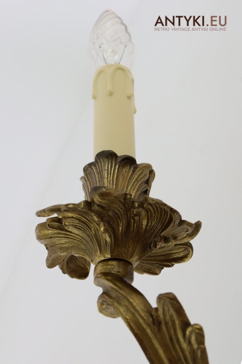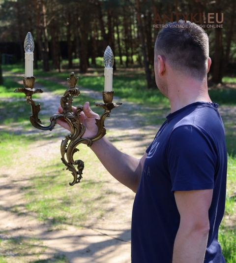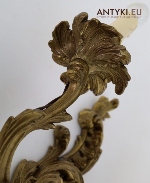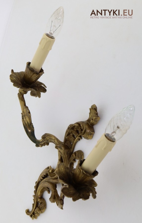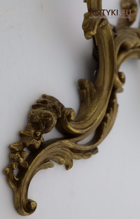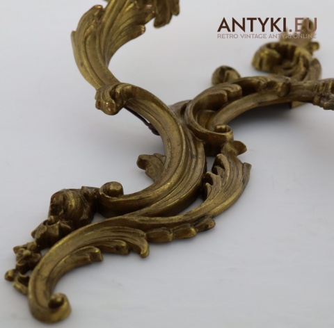 Przedstawiamy duży, dekoracyjny kinkiet ścienny wykonany z mosiądzu, inspirowany bogatym stylem barokowym oraz rokokowym. Ten wyjątkowy egzemplarz pochodzi z połowy XX wieku i został sprowadzony z Francji. Jego kunsztownie rzeźbiona forma i pełne wdzięku, florystyczne detale sprawiają, że jest to klasyczny, retro przedmiot z duszą, który idealnie wkomponuje się w eleganckie wnętrza.