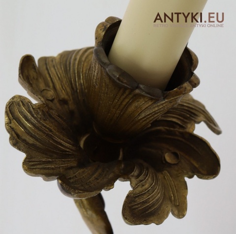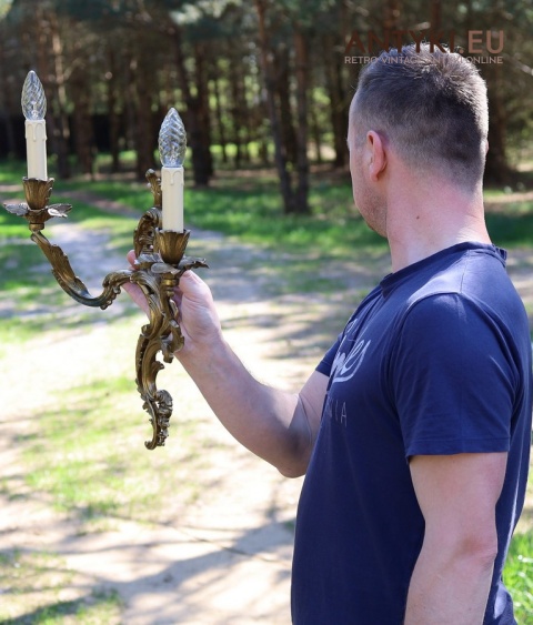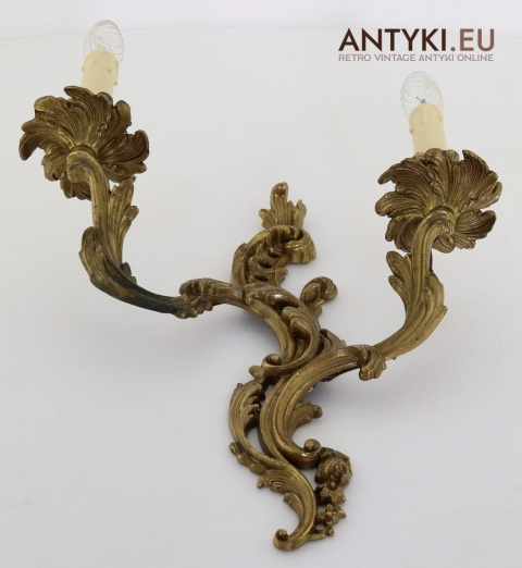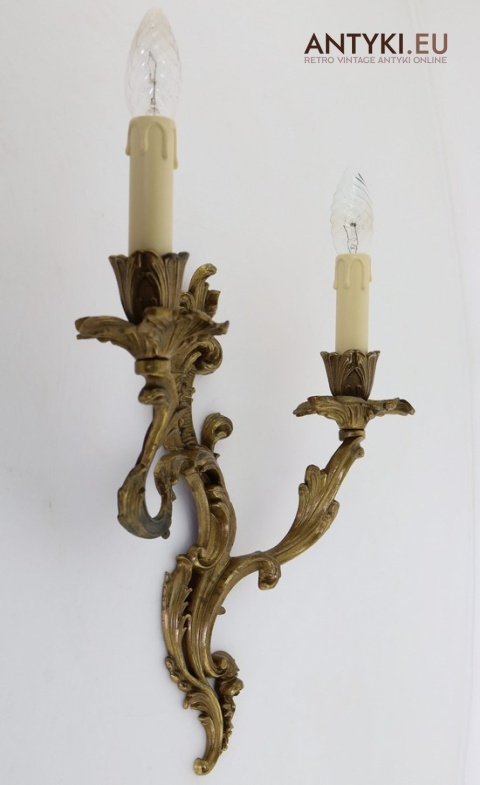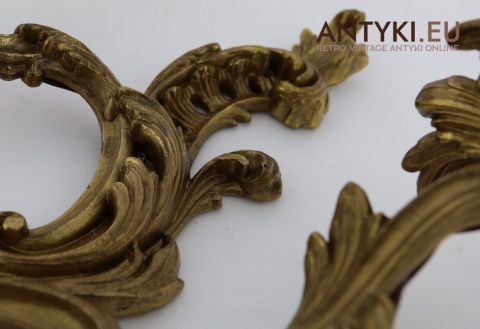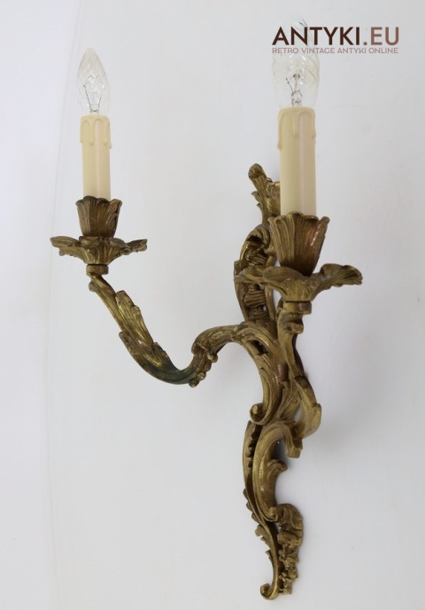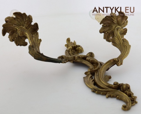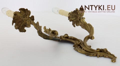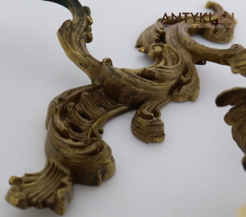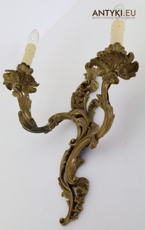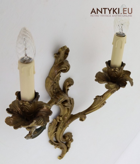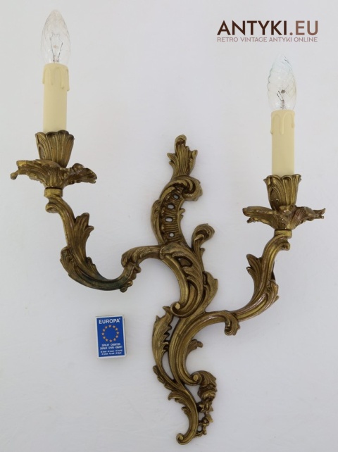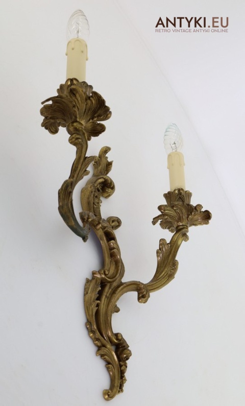 Przedstawiamy duży, dekoracyjny kinkiet ścienny wykonany z mosiądzu, inspirowany bogatym stylem barokowym oraz rokokowym. Ten wyjątkowy egzemplarz pochodzi z połowy XX wieku i został sprowadzony z Francji. Jego kunsztownie rzeźbiona forma i pełne wdzięku, florystyczne detale sprawiają, że jest to klasyczny, retro przedmiot z duszą, który idealnie wkomponuje się w eleganckie wnętrza.