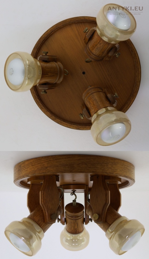 Ten wyjątkowy rustykalny plafon drewniany, jest wykonany z litego dębu, szkła + mosiądz. To oryginalne, retro oświetlenie z epoki, wyprodukowane w Niemczech (RFN) przez firmę Vormann & Fiß – co potwierdza zachowana oryginalna naklejka producenta z oznaczeniem modelu Nr 4.967/3 oraz znakiem certyfikacji VDE. Pochodzi z przełomu lat 70. XX wieku.